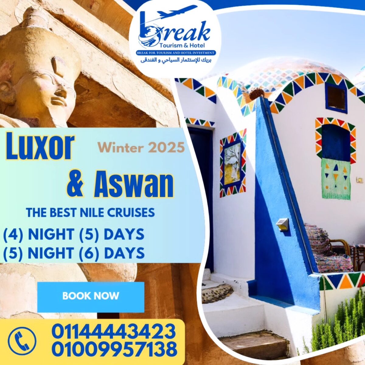 في الجنوب، باقات الأقصر وأسوان مع كروز نيل فاخر هتخليك تحس بالراحة المطلقة. ٤ أيام بين الكرنك ووادي الملوك ووادي الملكات، مع سهرة نوبية وموسيقى على السفينة. وللي بيحب الفولكلور، في جولة لقرى النوبة والقعدات الشعبية الأسطورية. الانتقالات بين المعابد والسيّارة مكيفة وبتوصلك لحد الباب.