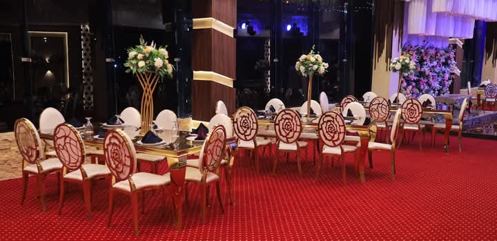 القاعة تستوعب عدد متوسط من الضيوف بطريقة منظمة وبتوفر توزيع مثالي للطاولات والكراسي بما يناسب شكل الحفل.