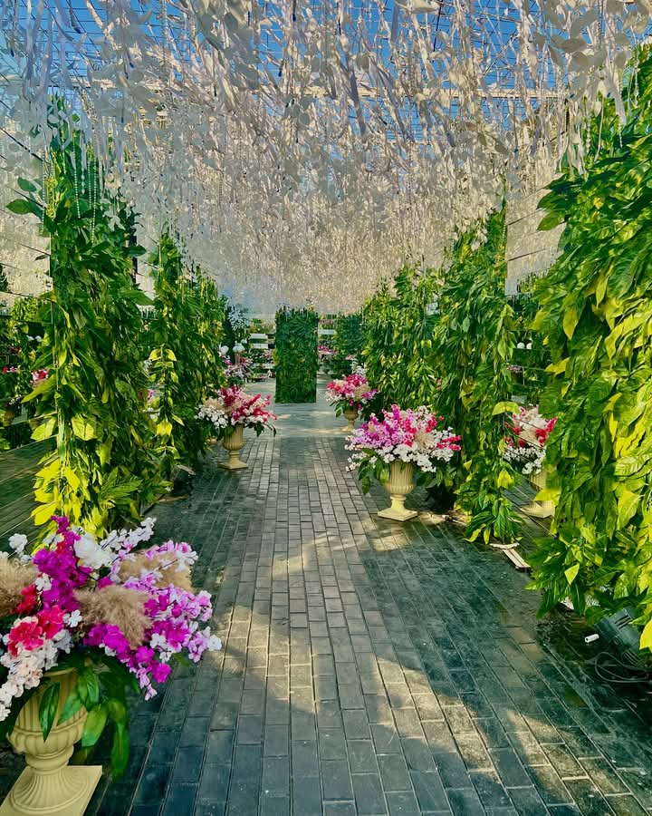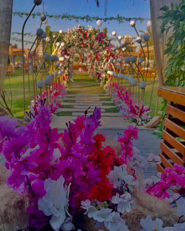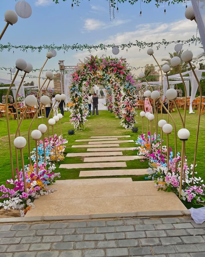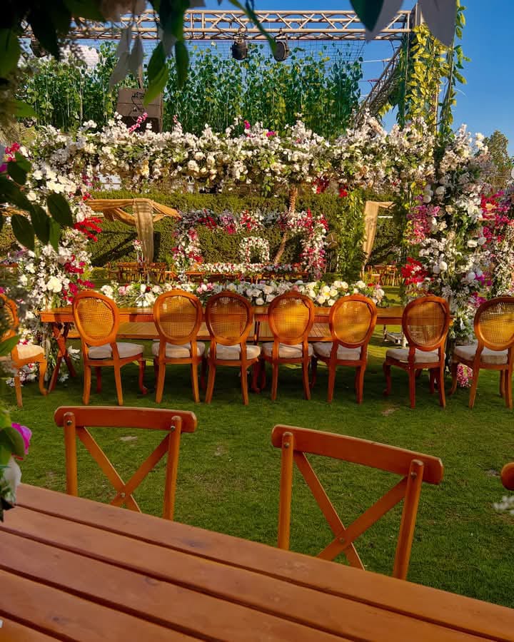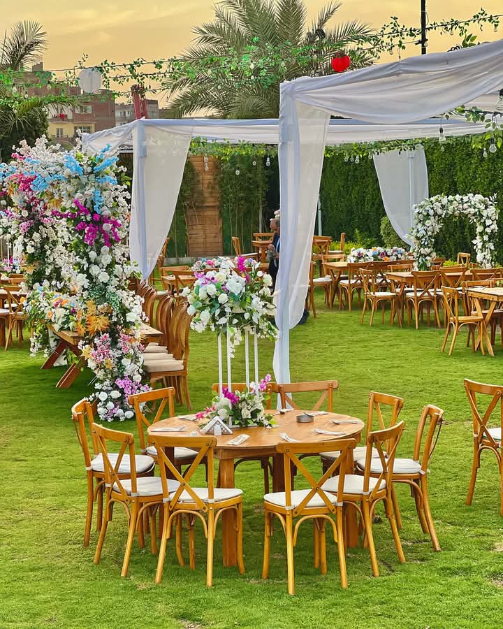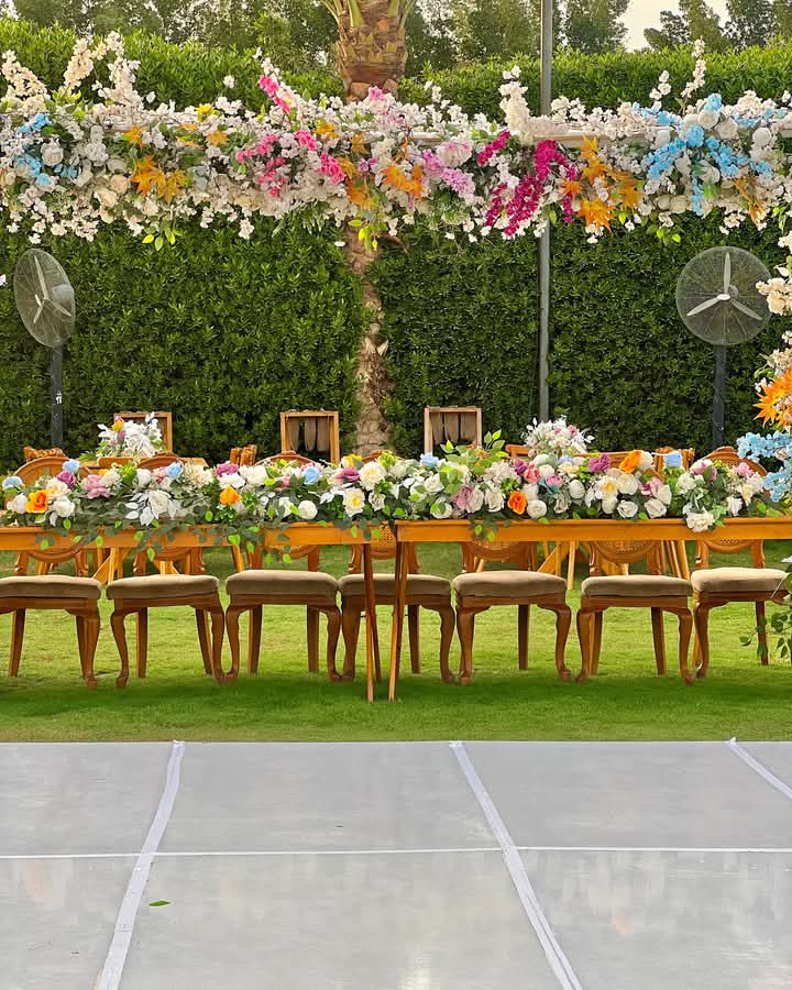 المكان محافظ على طابع بسيط وأنيق، بألوان مريحة، مع ديكورات مناسبة للأجواء المفتوحة اللي تخلي المناسبة شكلها طبيعي ومنظم.