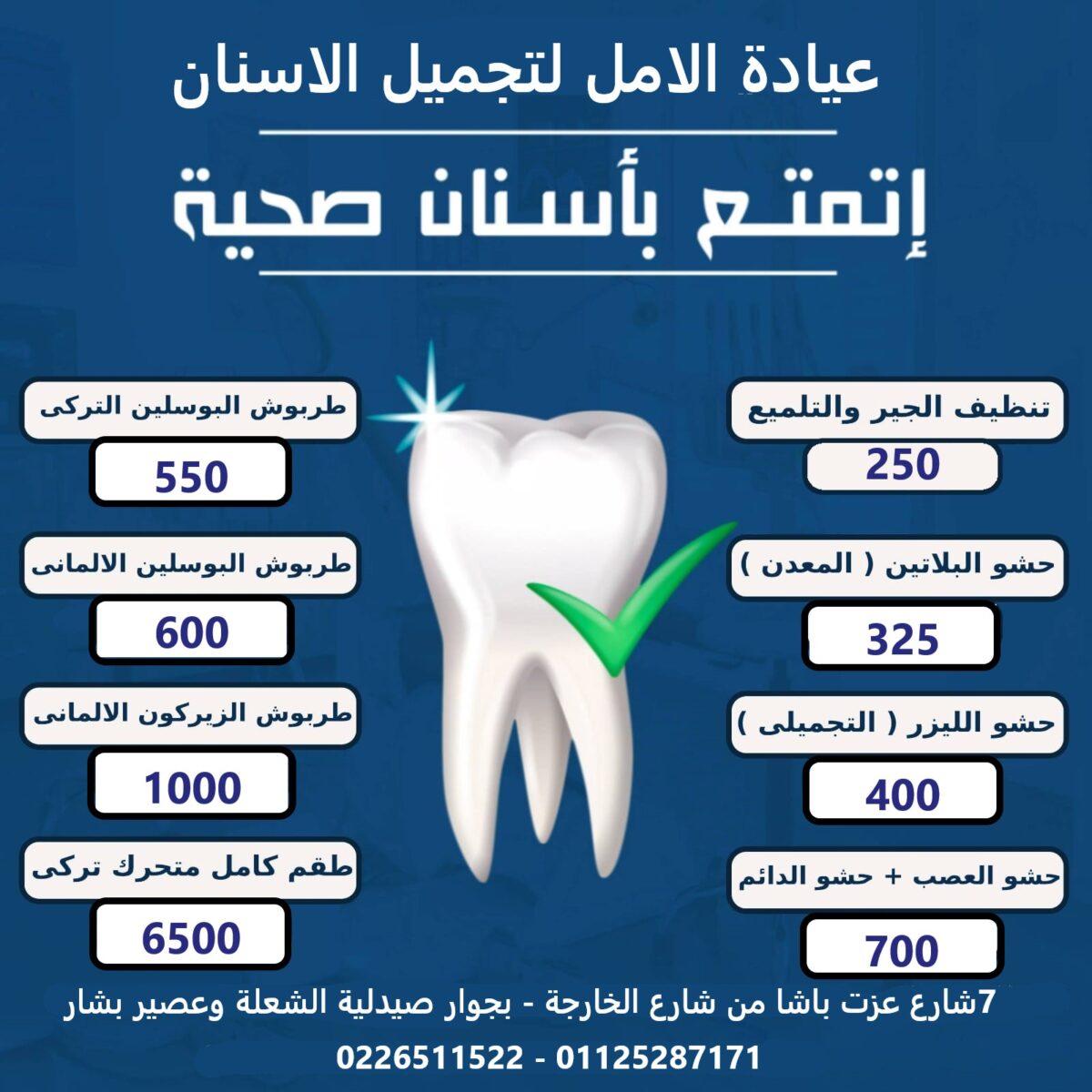 عيادة الأمل لطب وتجميل الأسنان من الأماكن اللي قدرِت تبني سمعة قوية وسط الناس، لأنها بتجمع بين الخبرة والدقة في الشغل، والمعاملة الراقية اللي بتخلي كل مريض حاسس بالراحة والثقة من أول زيارة. المكان هناك معمول بعناية شديدة ومجهز بأحدث الأجهزة اللي بتساعد في التشخيص والعلاج بدقة، وده بيخلي التجربة كلها سهلة ومريحة من أول لحظة.