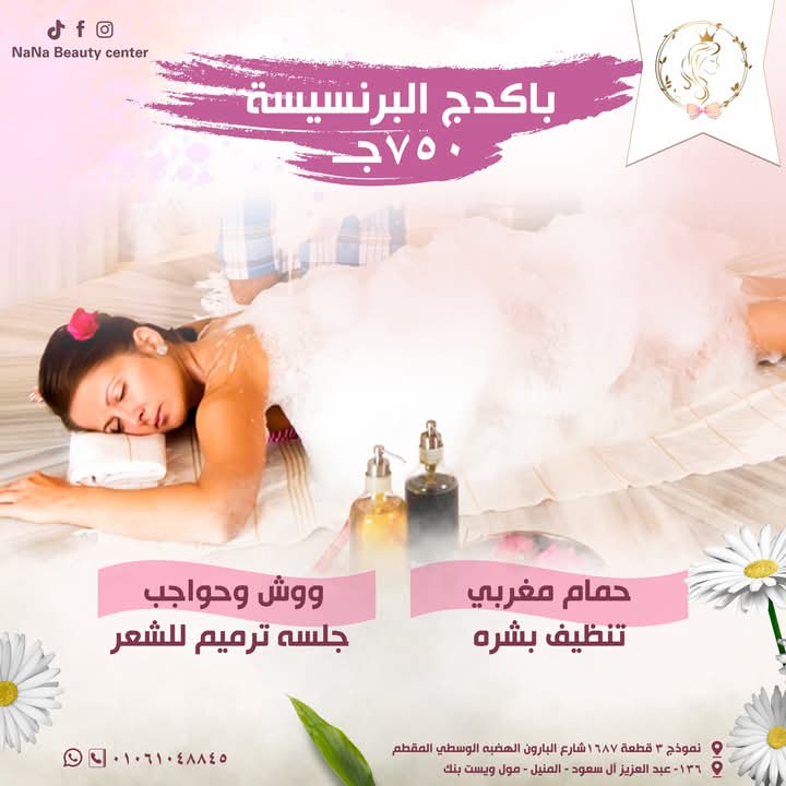لو حاسة إنك محتاجة تهتمي بنفسك وتعيشي تجربة استرخاء حقيقية، يبقى لازم تجربي Nana Beauty Spa. المكان معمول علشانك، علشان تعيشي لحظة راحة، تهتمي ببشرتك وشعرك، وتدلّعي جسمك كله وسط أجواء هادية ومريحة.