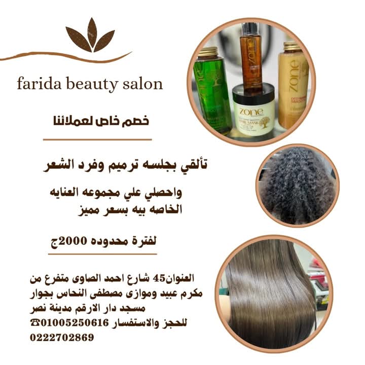 Farida Beauty Salon من الأماكن اللي بتقدملك تجربة تجميل هادية ومريحة، من أول ما تدخلي لحد ما تخرجي وإنتي شايفة فرق في شكلك ومودك. الصالون مش كبير، بس منظم، وكل ركن فيه معمول علشان يوفرلك خصوصية وراحة، سواء جايه تعملي خدمة بسيطة أو تهتمي بنفسك بشكل كامل.