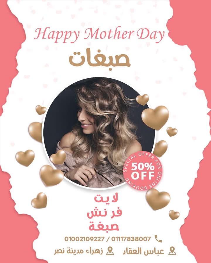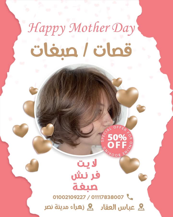 لو ناوية تغيري لون شعرك، فيه تشكيلة ألوان طبيعية وحديثة. الصبغة بتتعمل على مراحل، وبيتم اختبار اللون على خصلة صغيرة علشان النتيجة تطلع مظبوطة. المنتجات اللي بتستخدم خفيفة ومناسبة تحافظ على نعومة الشعر.