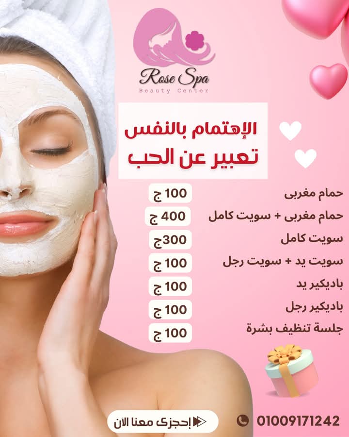 في وسط دوشة الحياة اليومية، كل واحدة فينا محتاجة وقت تهدي فيه أعصابها، تريح جسمها، وتدلّع نفسها بشوية عناية تستاهلها. وده اللي هتلاقيه في Rose Spa، سبا ناعم وراقي بيجمع بين الرقي، النظافة، والخصوصية، وكل ده في مكان مريح يخليكي تنسي الدنيا حواليكي.