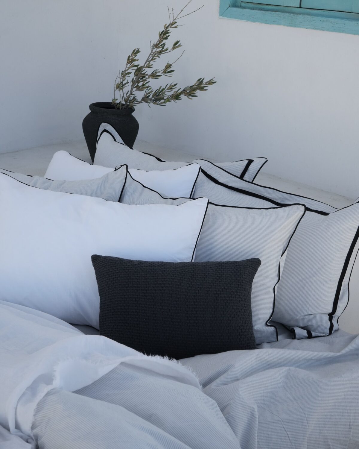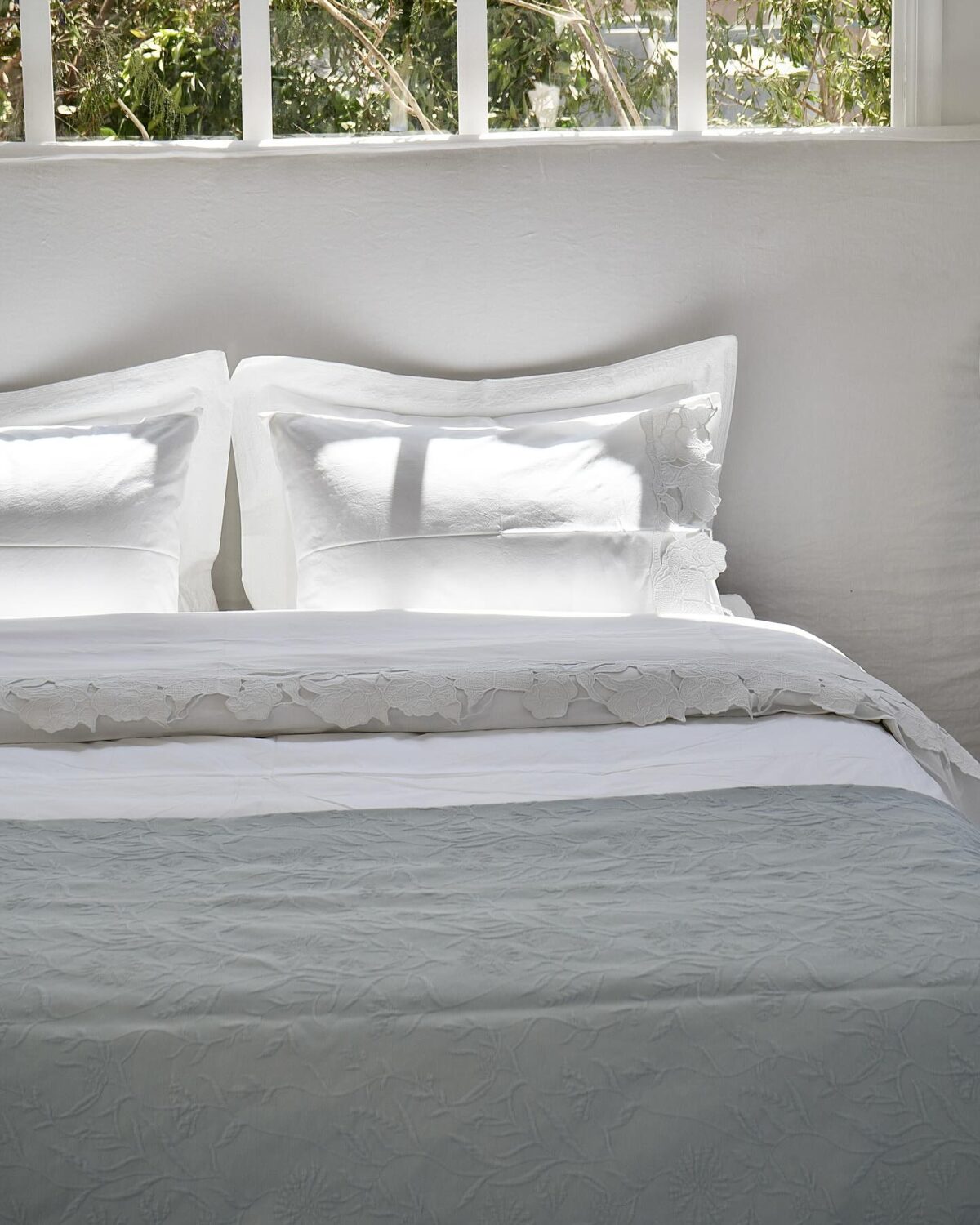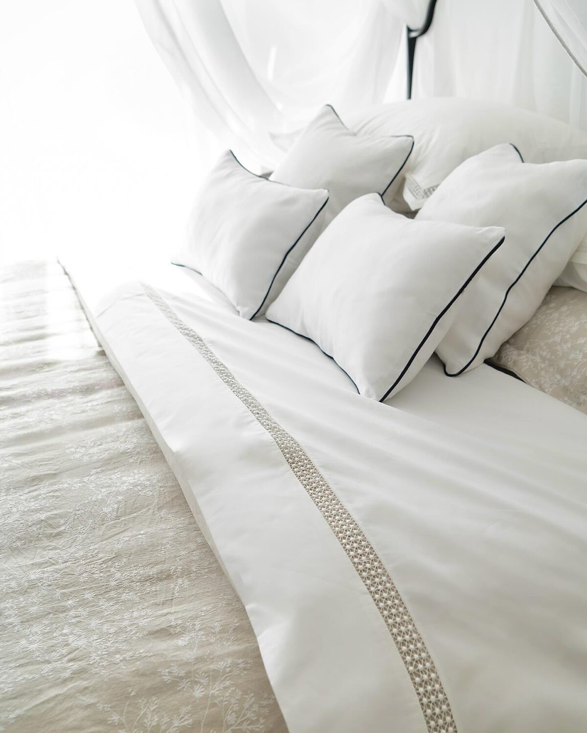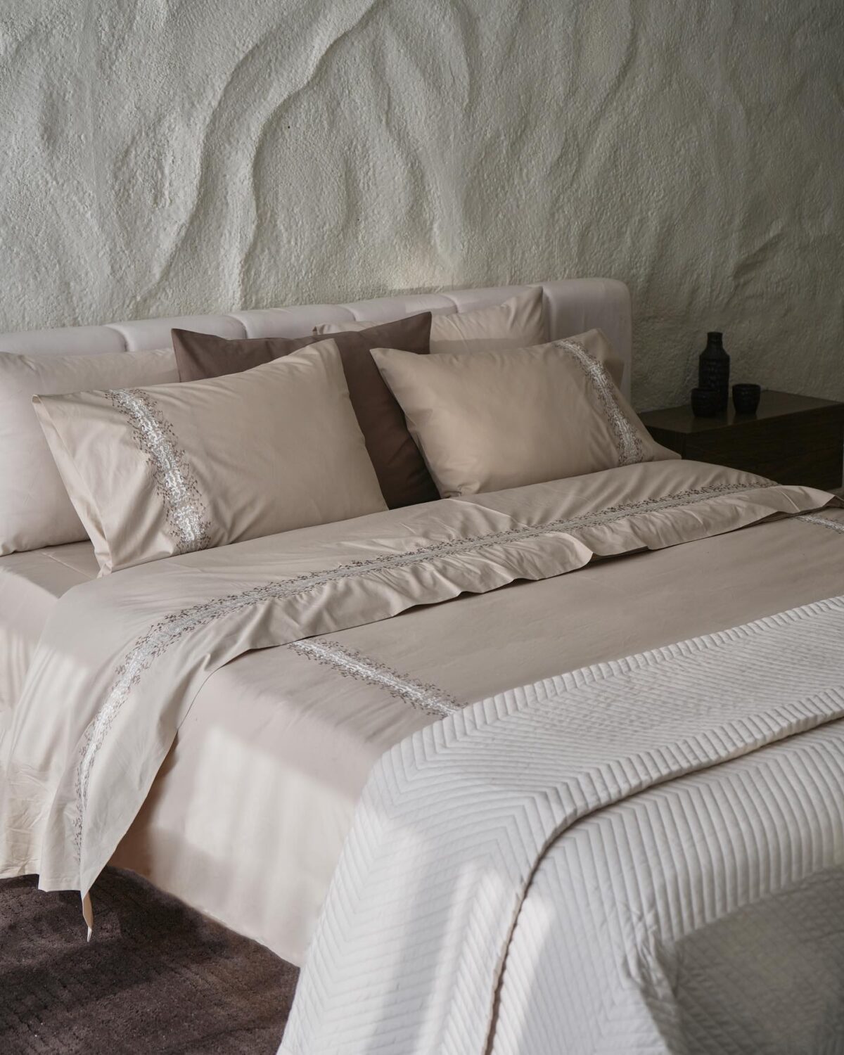 التفاصيل الدقيقة بتظهر في الملاية بجيب عميق 40 سم مع شريط سبانديكس داخلي، وكمان الخياطة المضاعفة عند الأطراف اللي تمنع تفكك الغرز. غطاء اللحاف بيتقفل بزرائر مخفية مبطنة قماشيًا لحماية الجلد وإضفاء لمسة فخامة، بينما الحافة مطرزة بخيوط ناعمة بشكل زهرة الليليوم، شعار المحل.