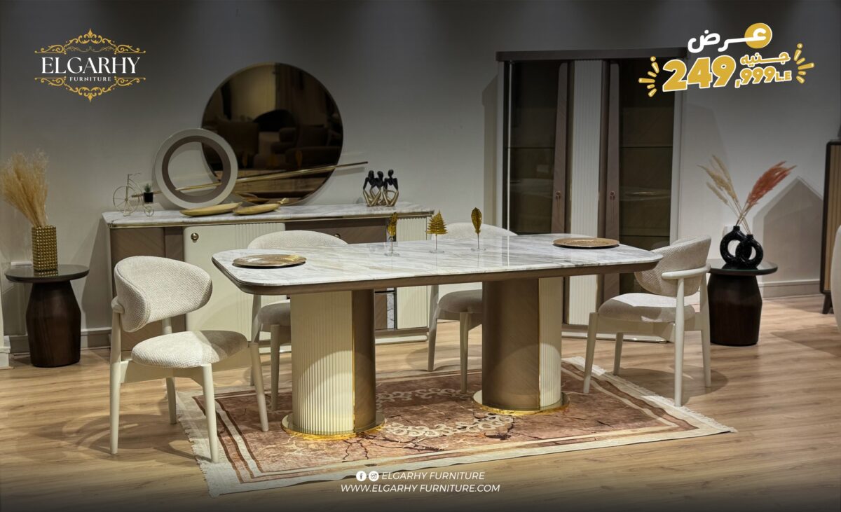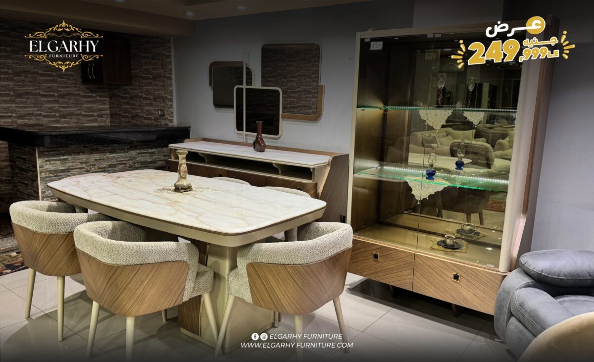 السفرة هناك تصميماتها بسيطة لكنها أنيقة، الطاولات بتكون خشب أو بسطح رخامي، والكراسي مريحة وتنجيدها شيك. فيه موديلات صغيرة تكفي 4 أفراد، وموديلات أكبر لعيلة أو عزومات، وكله بنفس مستوى الجودة.