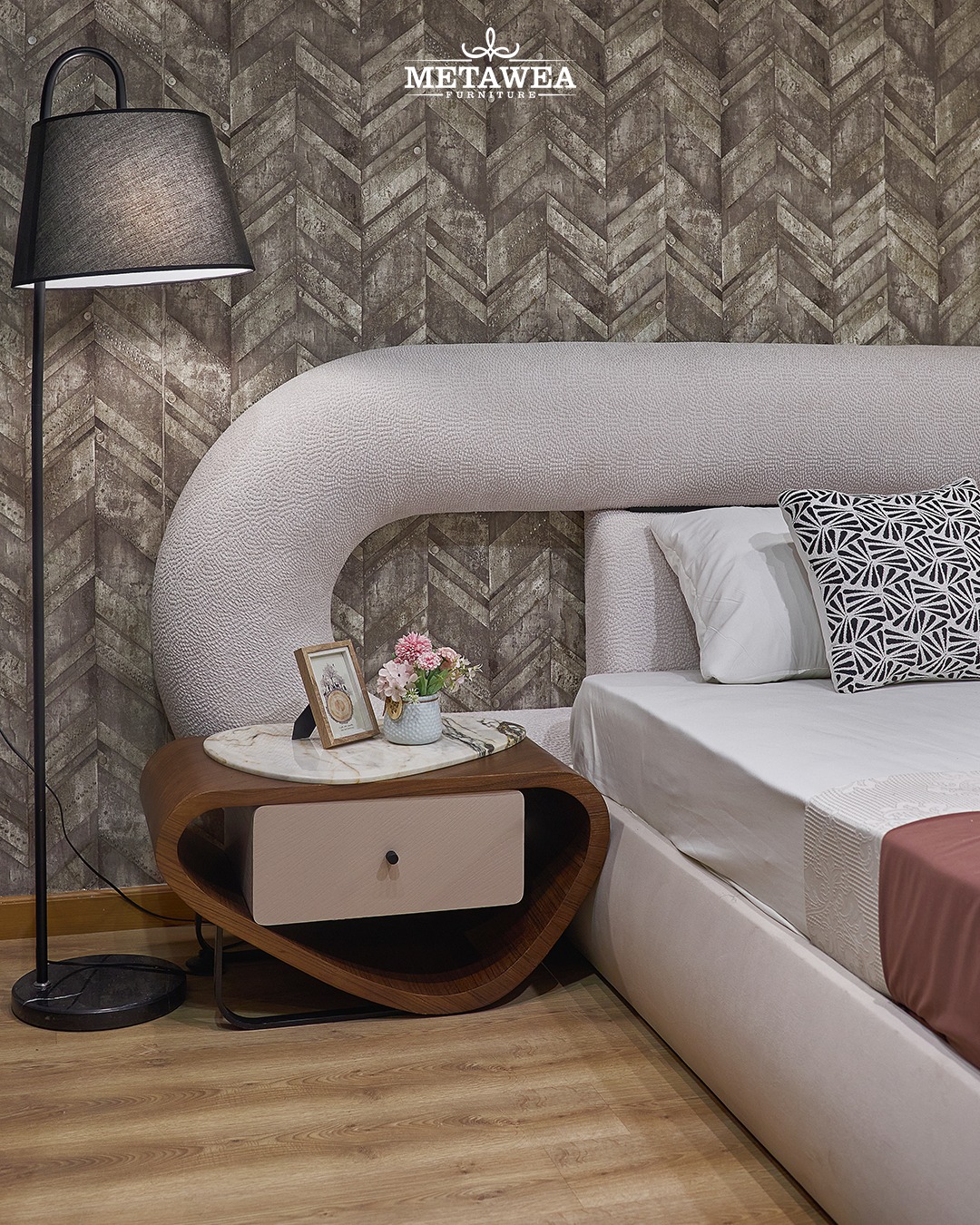 – سرير Low-Profile خشب زان أو كونتر متين، وتحت القاعدة درج تخزين مخفي يستغل المساحة كويس.