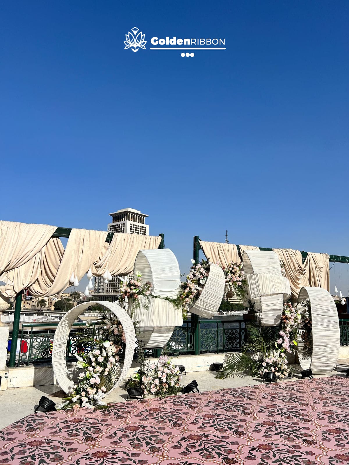 خدمة Golden Ribbon EG مبتقتصرش بس على البيع والتسليم هما بيقدموا كمان تنسيق وتنفيذ كامل في يوم الفرح فريقهم بييجي على المكان قبل الفرح بساعات عشان يركب ويضبط كل حاجة وبيراعوا معاك جدول زمني دقيق من محاكاة دخول الضيوف لغاية انتهاء الحفل وبعدها بيتابعوا معاكي للتأكد ان كل حاجة مظبوطة ومكانها المناسب