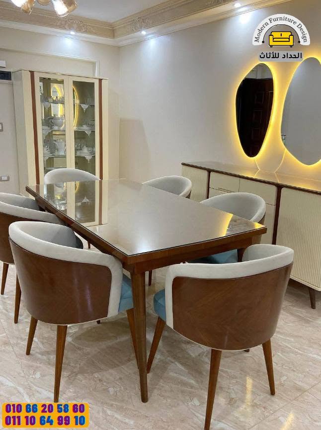 السفرة في الحداد برضه ليها حضور قوي. الترابيزة خشبها متين وتفاصيلها راقية، الكراسي مريحة وتنجيدها نضيف، والموديلات بتجمع بين البساطة والعملية. سواء بدور على سفرة صغيرة للمساحة الضيقة أو سفرة أكبر للريسبشن، هتلاقي موديلات تناسب البيت وتدي له شكل متناسق.