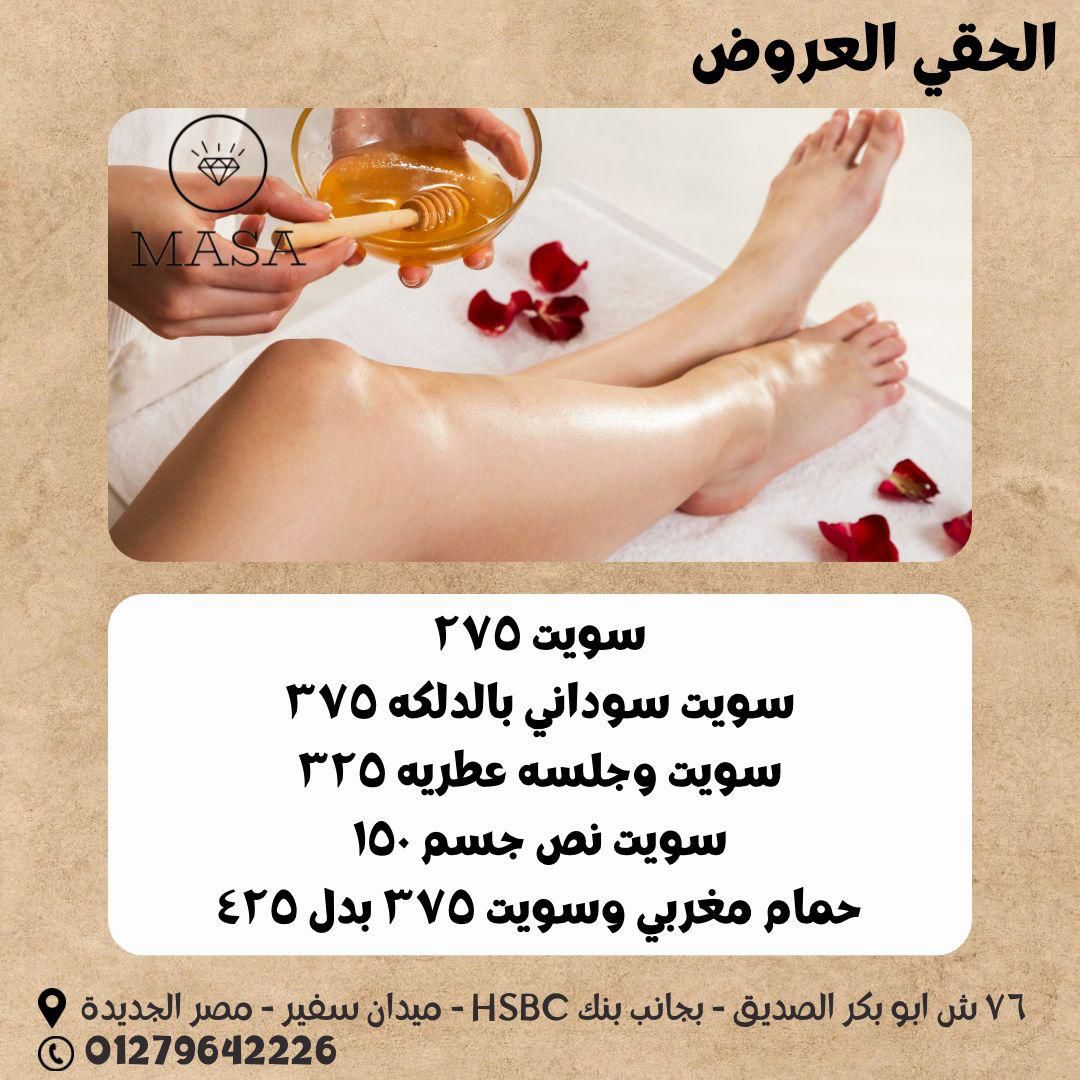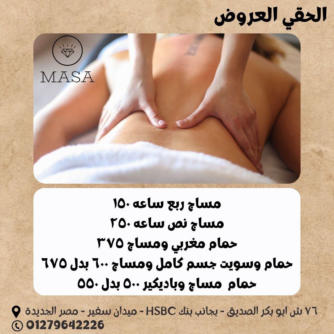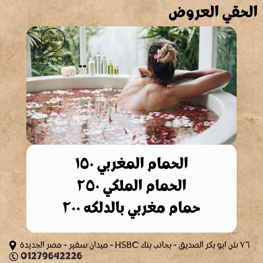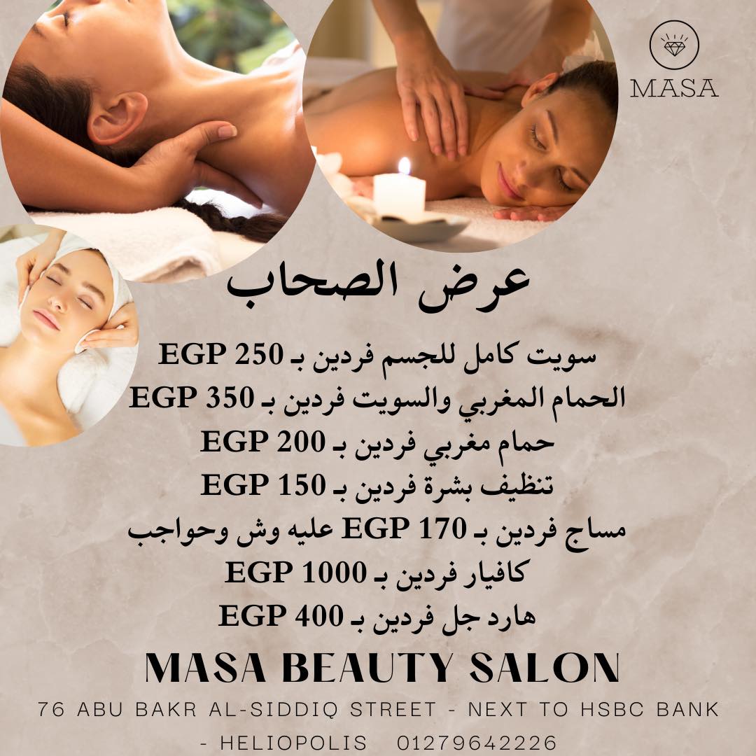 وفيه كمان الحمام المغربي اللي يعتبر من أكتر الحاجات اللي الستات بتحبها في Masa Beauty Salon. الجلسة بتبدأ ببخار بسيط يفتح المسام، بعدين صابون بلدي طبيعي، والجوانتي المغربي بيشيل الجلد الميت، وفي الآخر ماسك خفيف أو زيت عطري بيخلي الجلد ناعم وريحته مميزة. بعد الجلسة بتحسي إنك خفيفة وراحة جسمك مختلفة تمامًا.