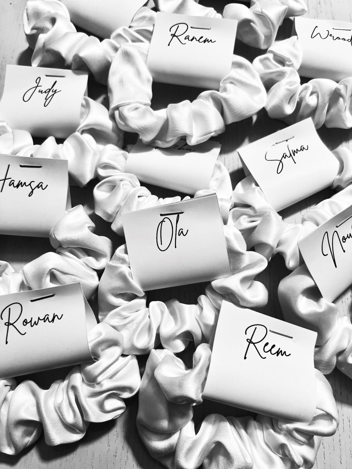 - ربطة أنيقة من شرايط ستان أو شيفون مع لمسات لؤلؤ أو ورق أخضر.