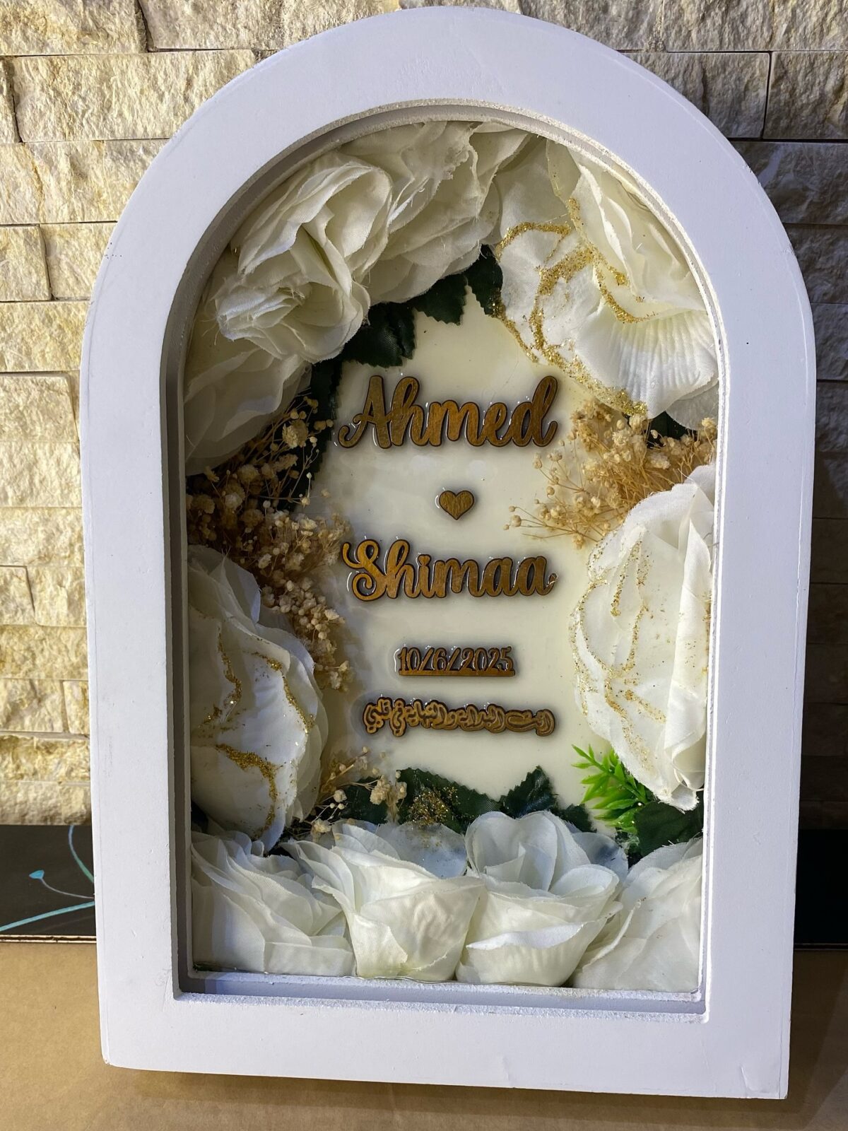 - محفور عليها اسمك وتاريخ كتب الكتاب بالليزر أو متدمج جوّه الرزين.