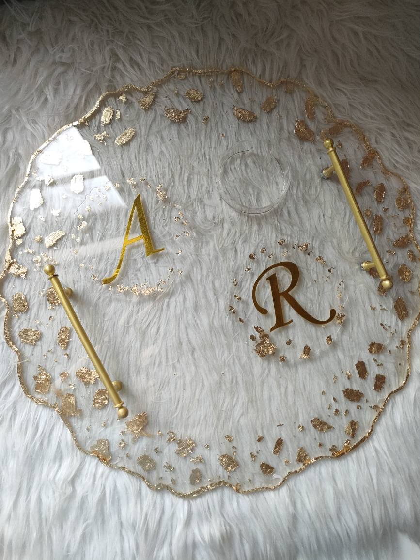 - صواني شبكة من معدن أو أكريليك، مزينة بشرائط وورد صناعي متناسق مع باقي الإكسسوارات.