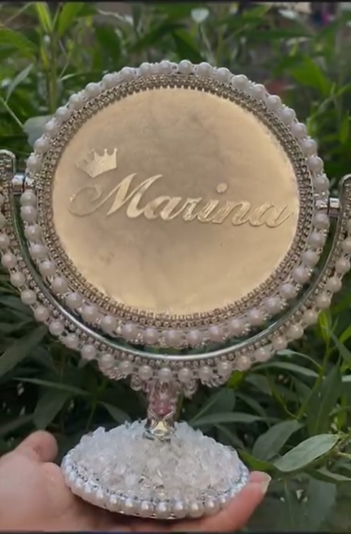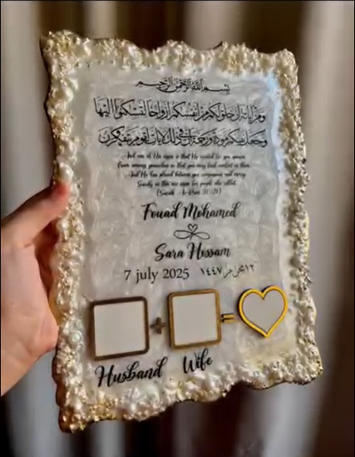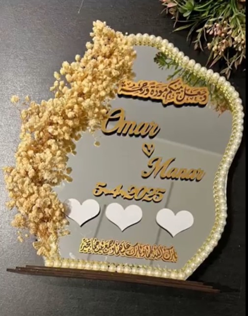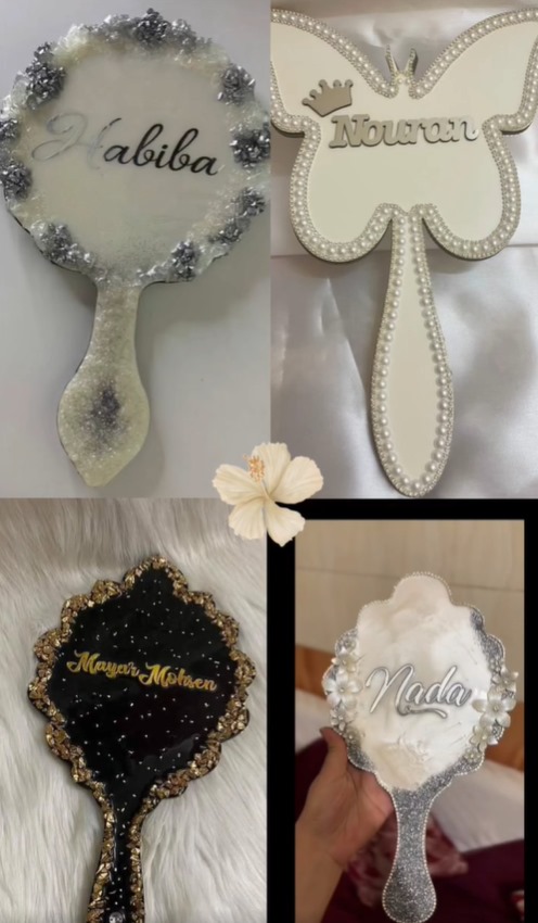 - مرايات كتب الكتاب معمولة بالريزن، متزينة بالأسماء والتاريخ ولمسات من الورد أو الجليتر.