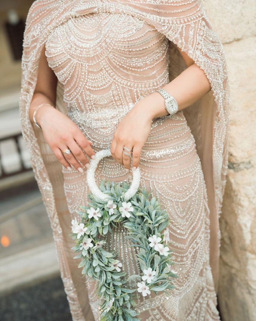 - ربطة من شرايط ستان أو شيفون مع لمسات لؤلؤ أو ورق أخضر.