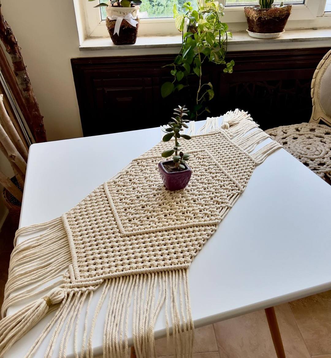 كمان عندهم رانرات مكرمية بتدي لمسة أنيقة جدًا للسفرة أو الطاولات. الرانر ممكن يكون بسيط بألوان حيادية زي الأبيض والأوف وايت، أو فيه تفاصيل زخرفية بخيوط ملونة تناسب المناسبات أو العزومات.