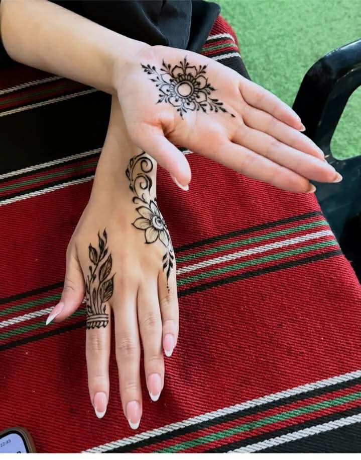 الحنة نفسها بقت ليها أشكال كتير تناسب كل الأذواق، فيه رسومات بسيطة وناعمة بتدي شكل رقيق، وفيه نقوش كبيرة مليانة تفاصيل بتكون واضحة في الصور وبتبرز جمال الإيدين بشكل أكبر. وعلشان كده اختيار الرسمة المناسبة بيكون على حسب ذوق العروسة واستايلها علشان تكون متناسقة مع باقي الإطلالة.