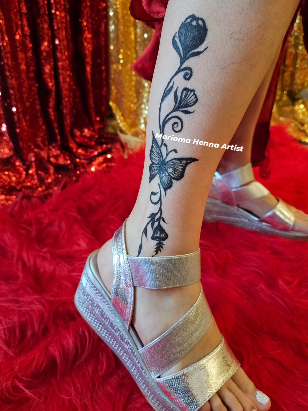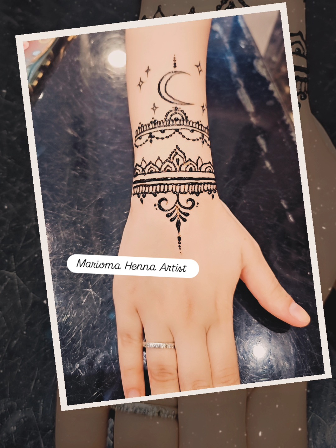 في التنفيذ، مريومة Henna Artist بتستخدم حنة طبيعية 100% من مصادر موثوقة، خالية من أي إضافات كيماوية. قبل الرسم بيتعمل اختبار بسيط على بشرتك عشان نتأكد من عدم وجود حساسية. بعدها بتتنضف المنطقة كويس وبتترطب بكريم خفيف يساعد إن اللون يثبت ويبان أوضح.