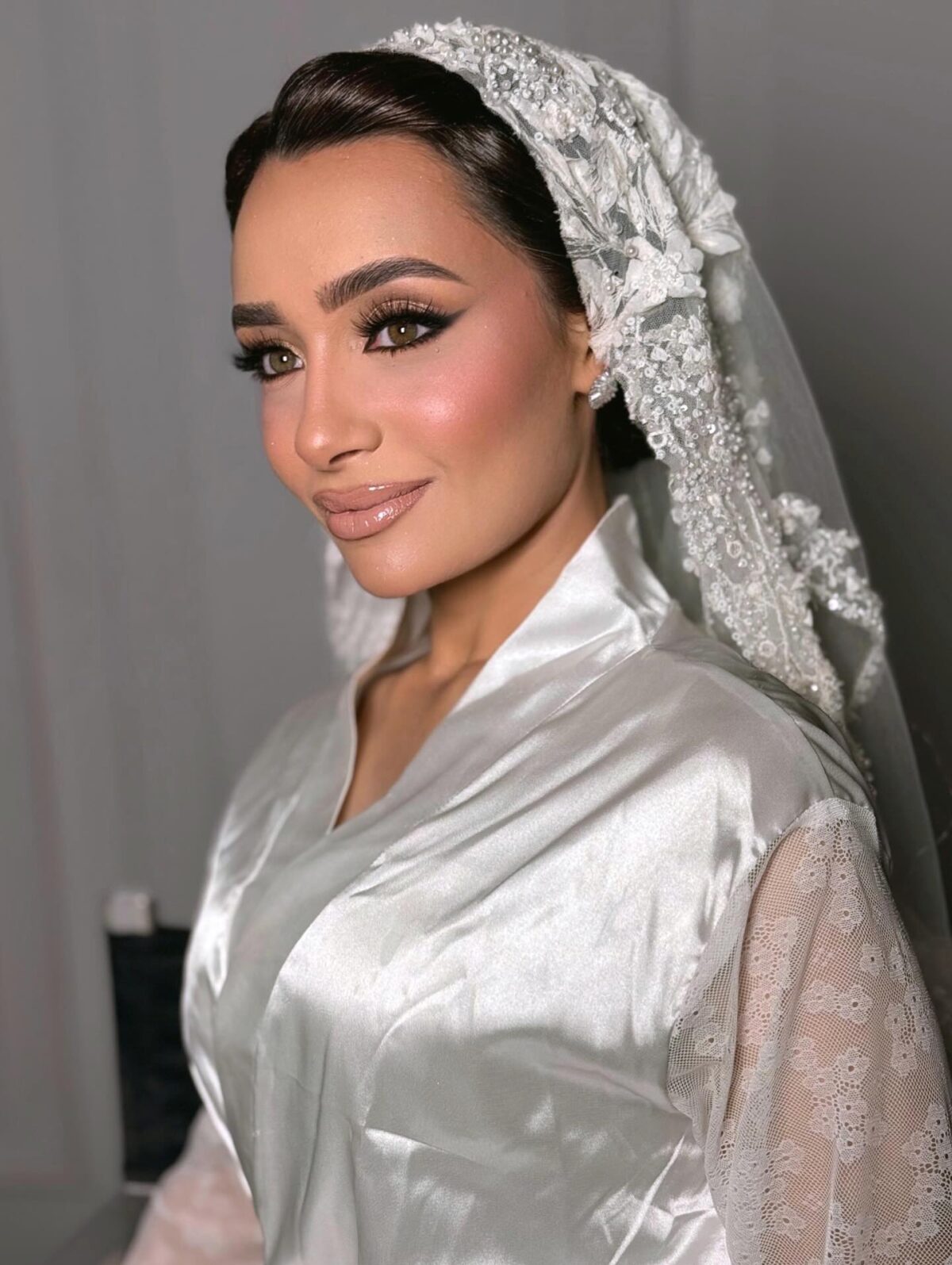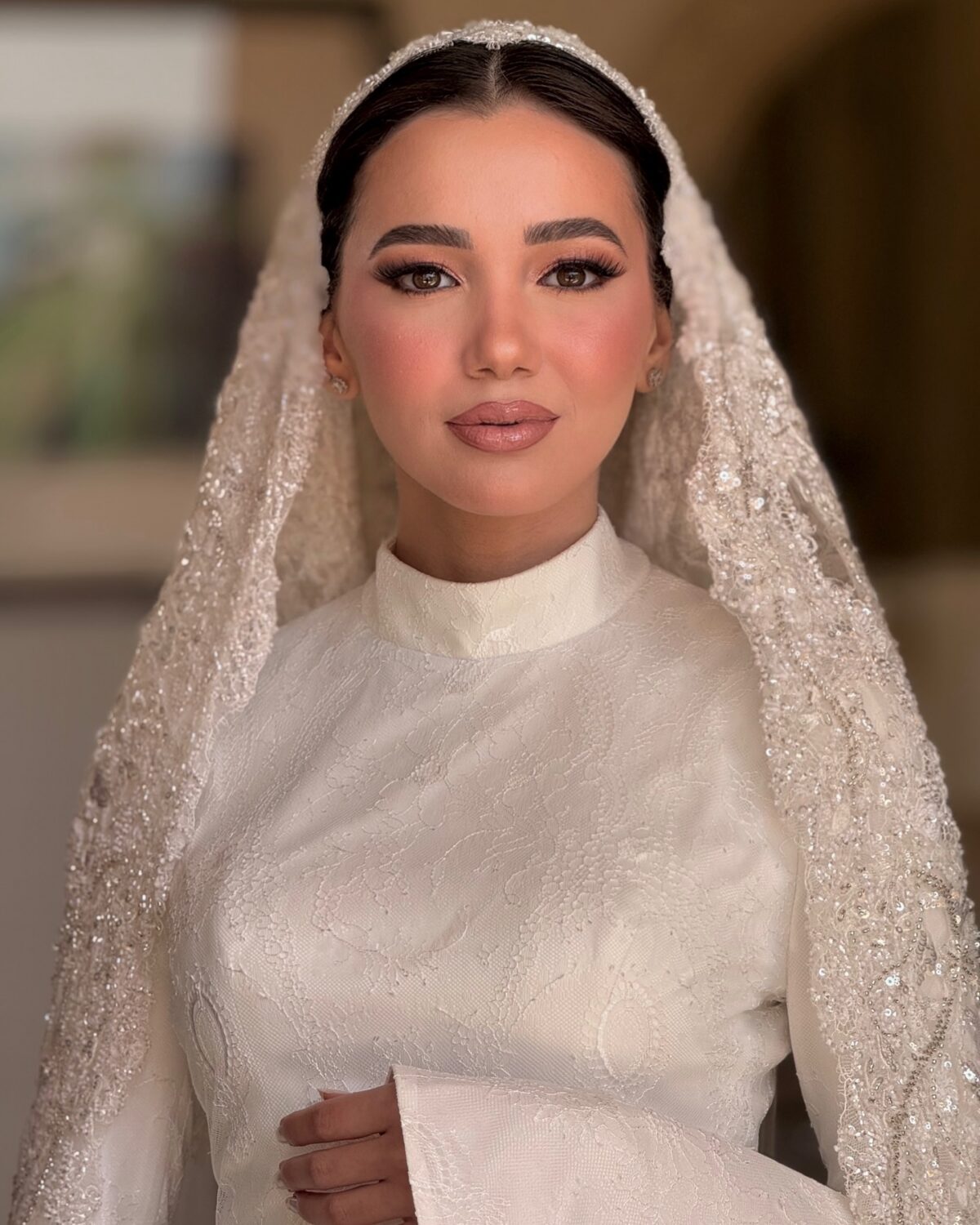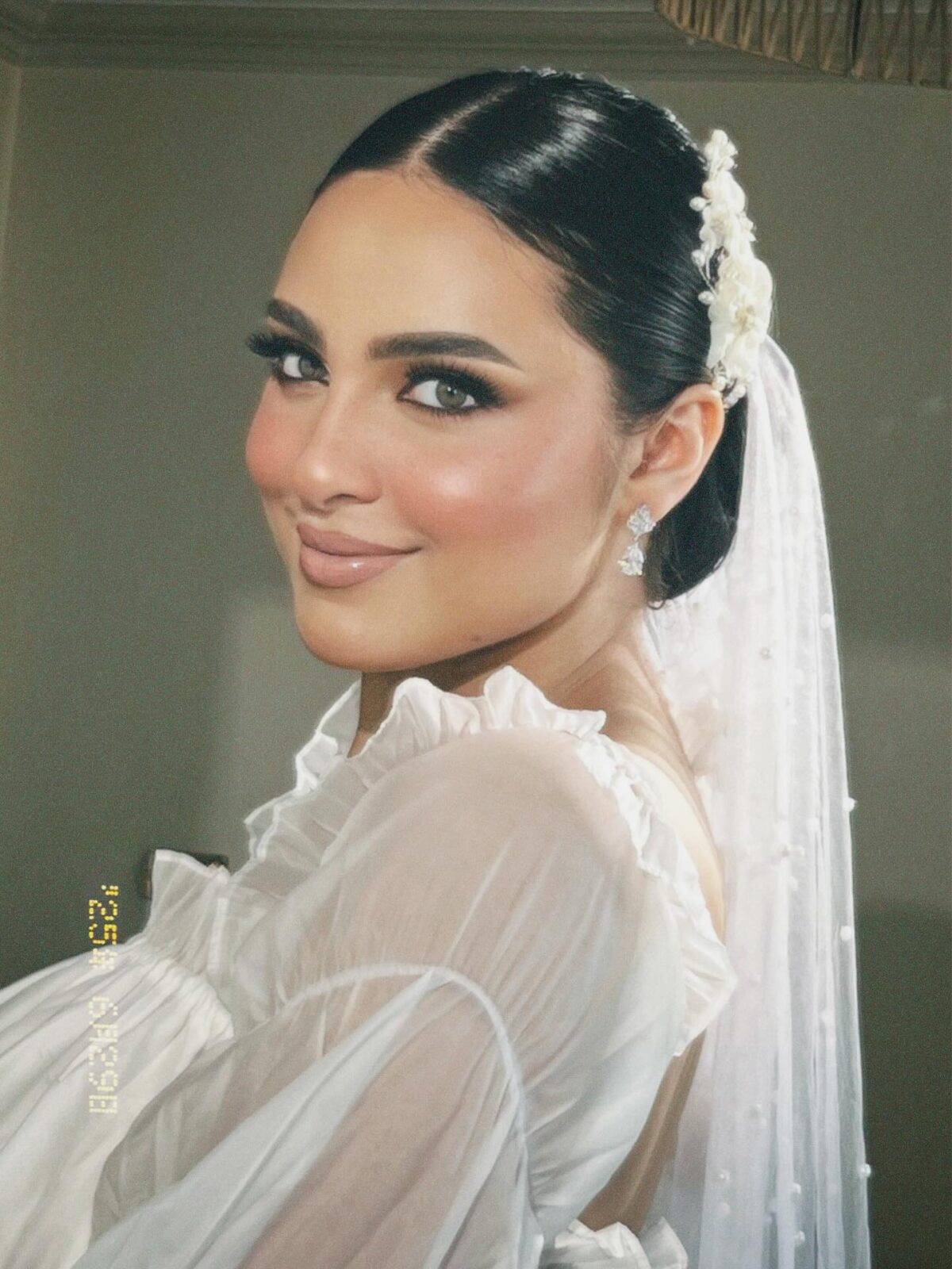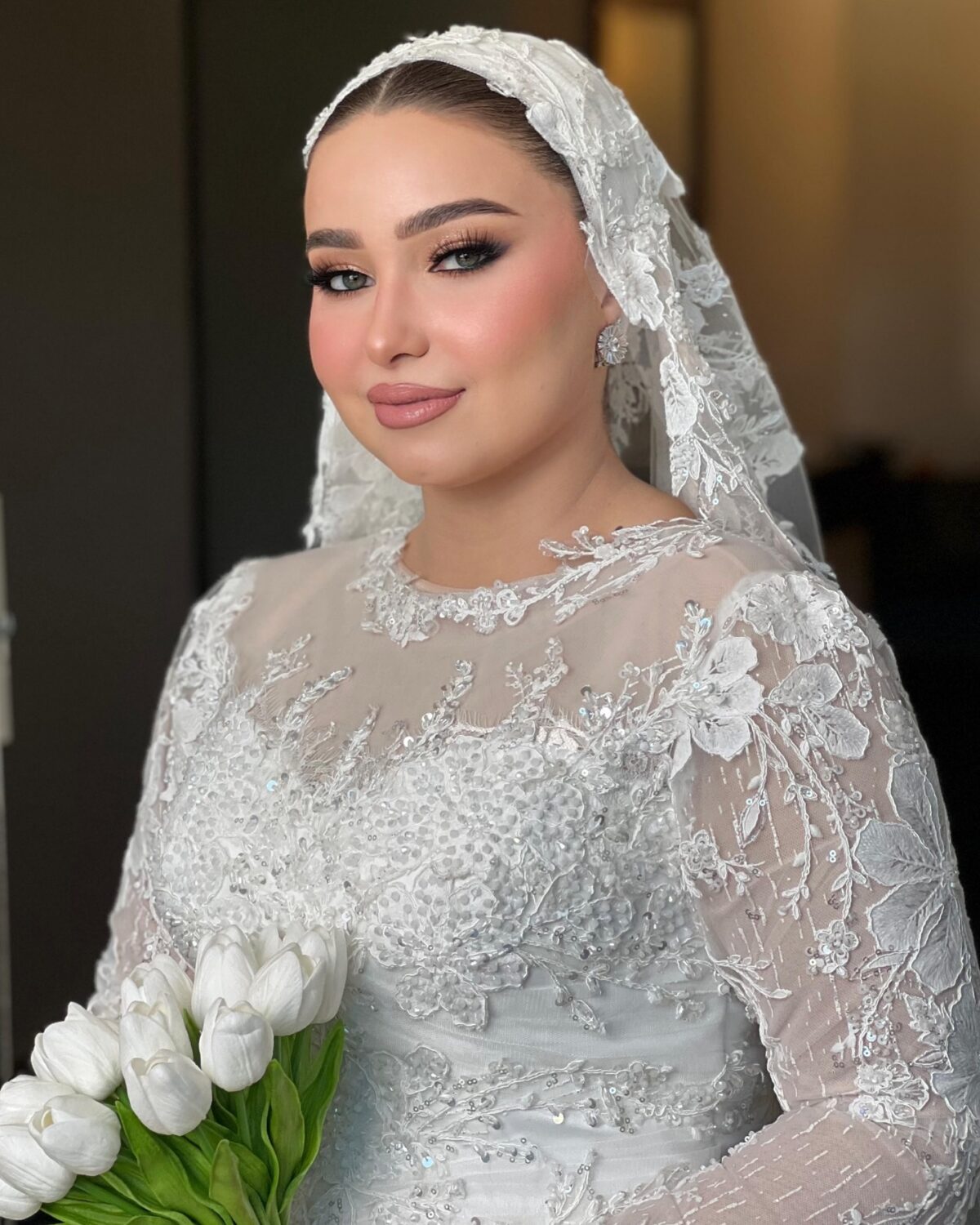 أما لو العروسة أو العميلة حابة لوك أقوى، أسماء بتعرف توازن بين الجمال الطبيعي والجرأة. ممكن تستخدم سموكي ناعم بدرجات رمادية أو نحاسية، وتختار لون شفايف قوي زي الأحمر أو النبيتي، لكن دايمًا بتخلي الشكل النهائي راقي ومتناسق. عندها حس فني عالي جدًا في توزيع الكونتور والهايلايتر بطريقة ناعمة تبرز الملامح وتدي إشراقة صحية من غير مبالغة.