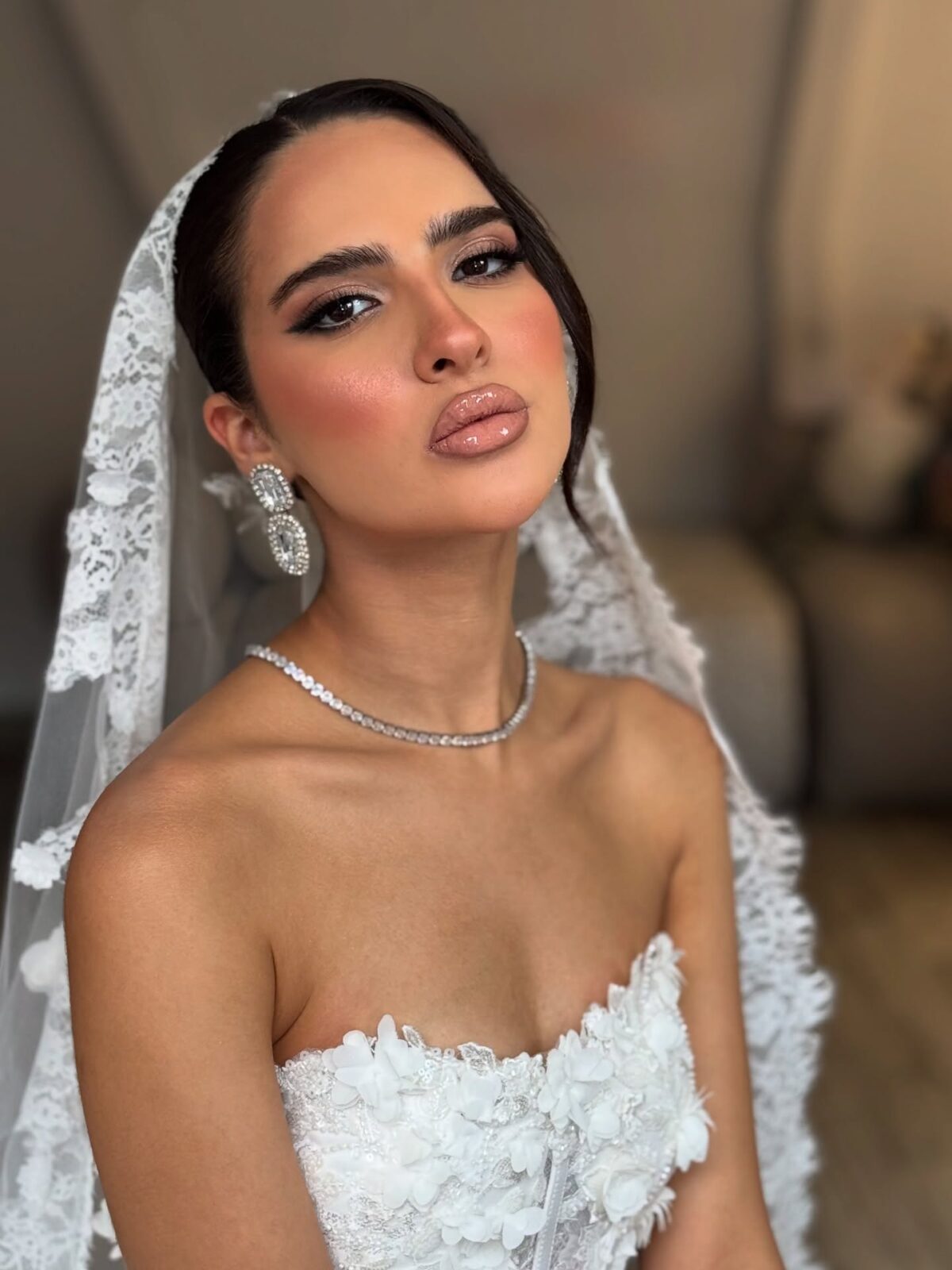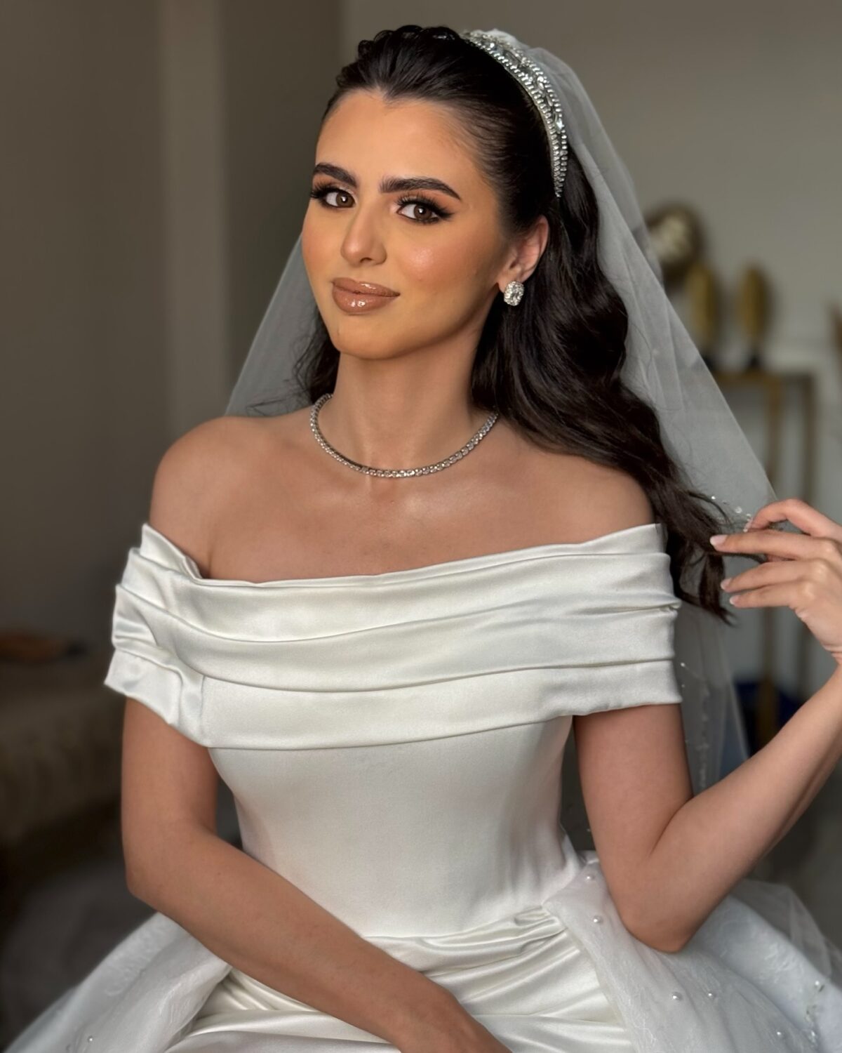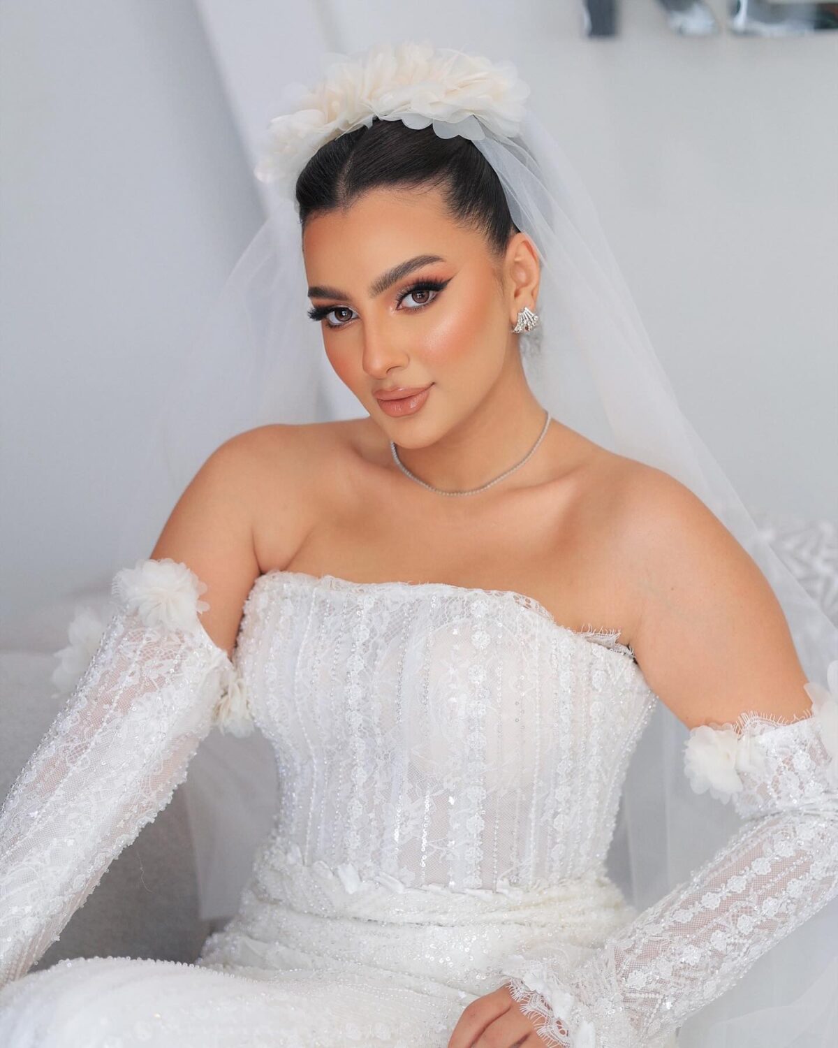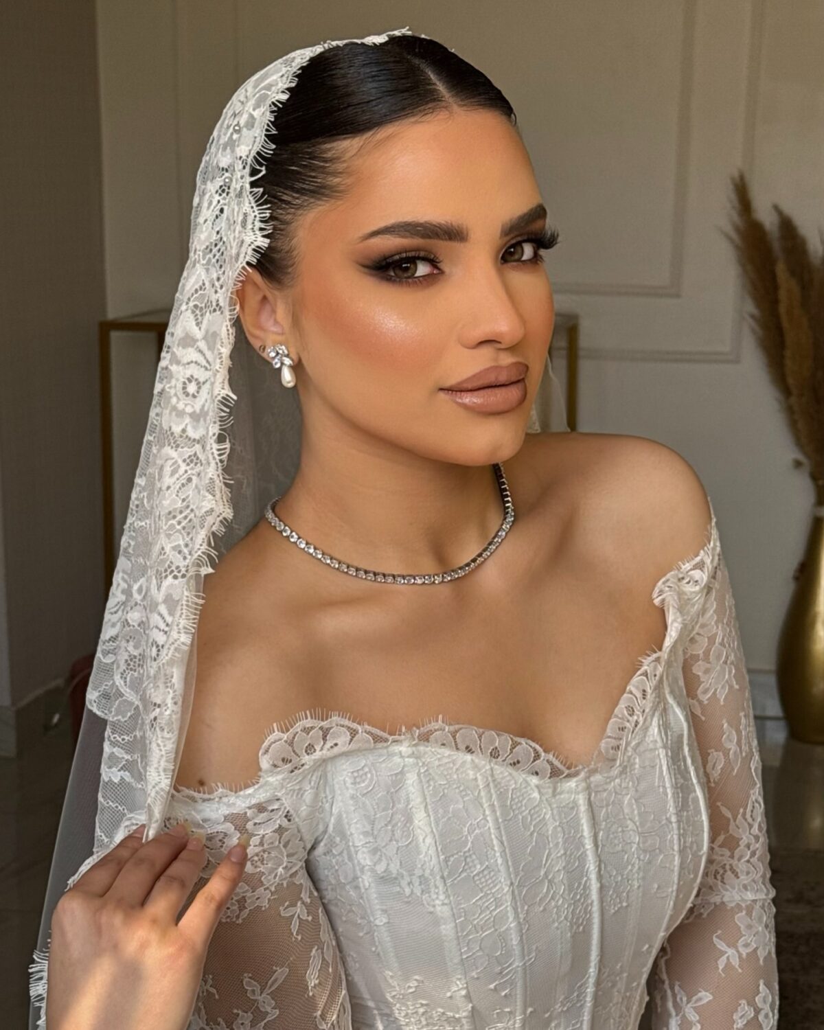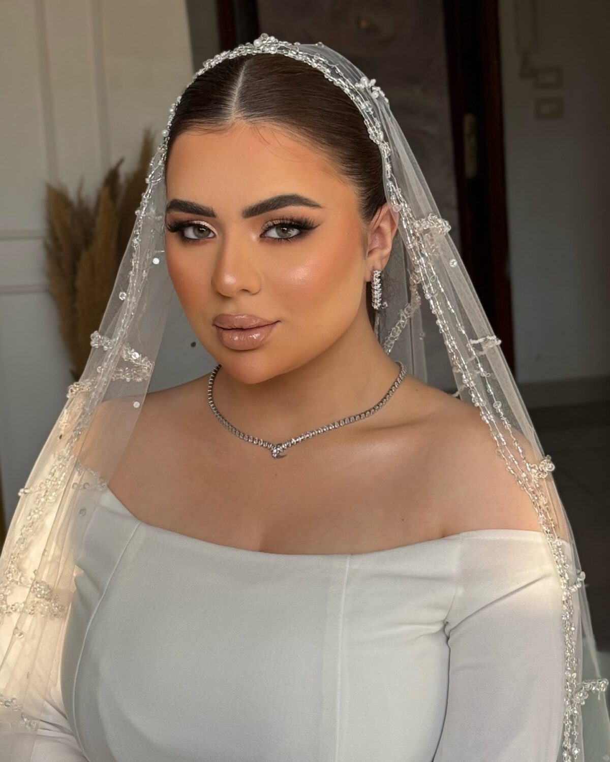 لو العروسة بتحب اللوك الجريء، فاطمة بتعرف تعمل التوازن بين الألوان القوية والرقة. ممكن تستخدم سموكي ناعم بدرجات رمادية أو نبيتي، مع روج قوي زي الأحمر أو الوردي الغامق، وبتعرف توزع الإضاءة والهايلايتر بطريقة تدي لمعة أنثوية جذابة من غير ما تبان زائدة.