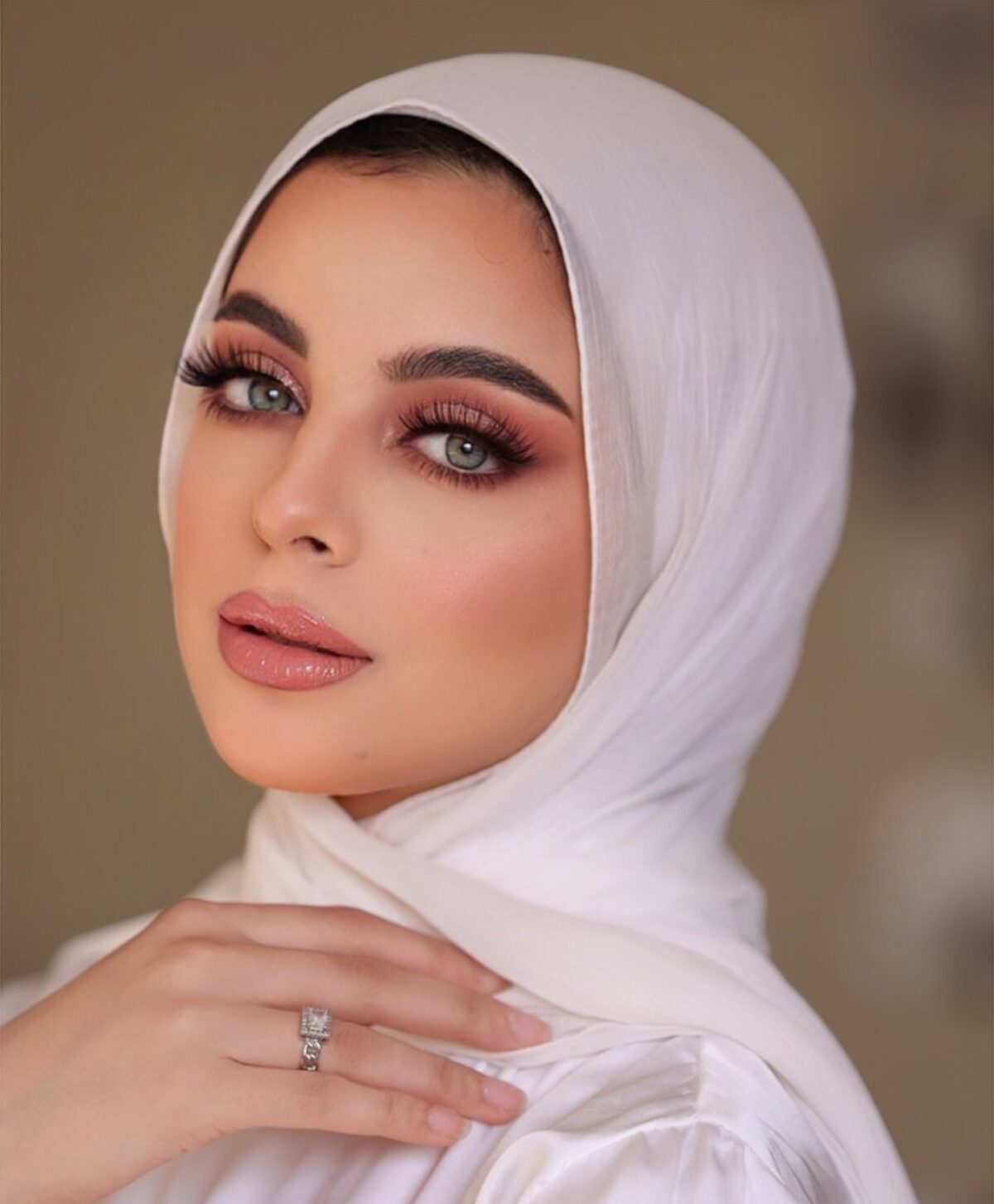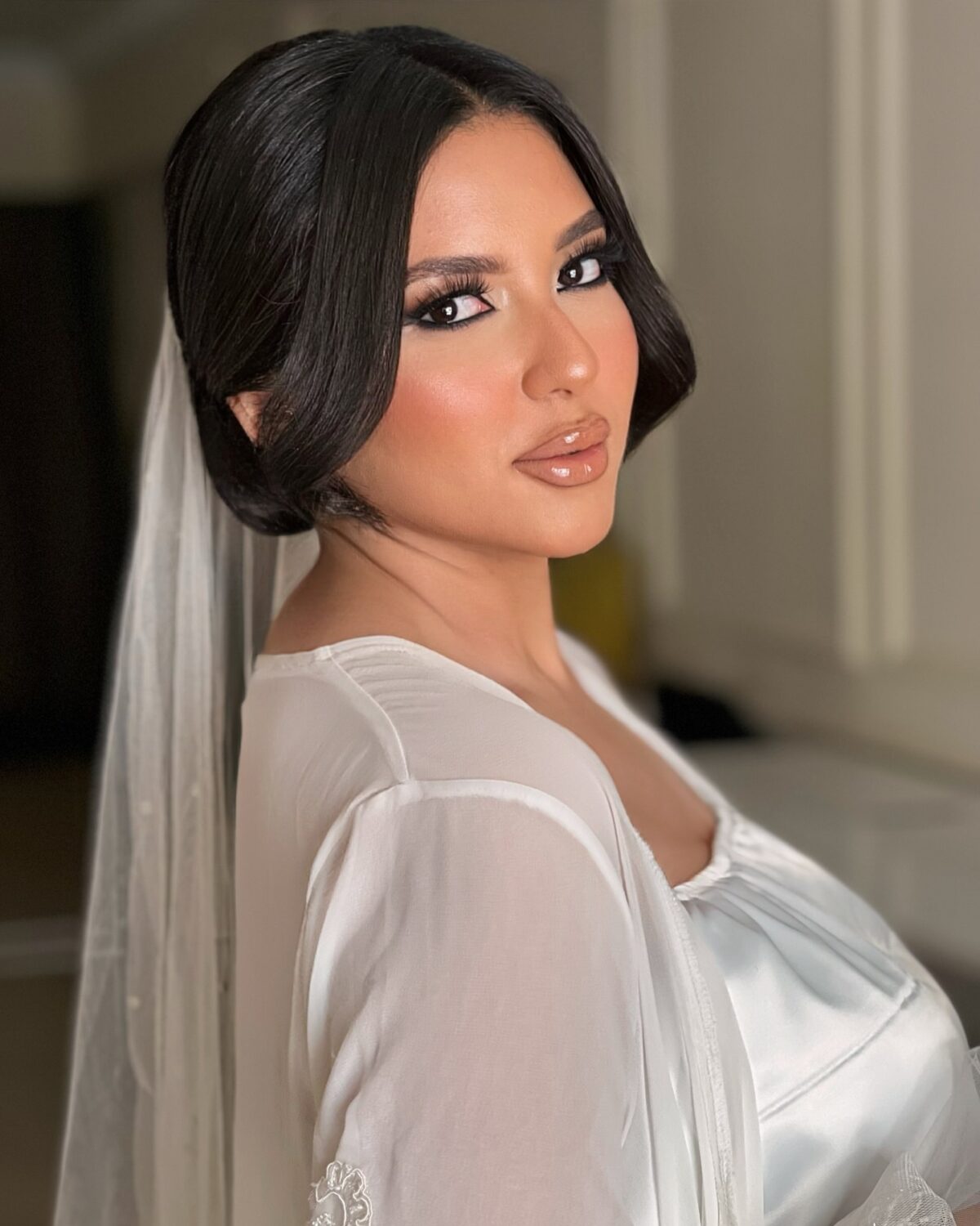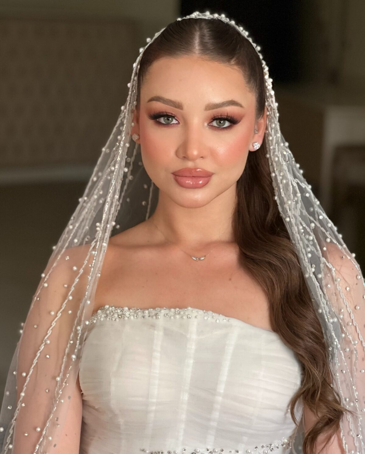 ولو العروسة حابة لوك جريء أكتر، هدير بتعرف تعمل التوازن بين الألوان القوية والهدوء. ممكن تستخدم سموكي بدرجات رمادية أو نحاسية، وتختار روج بدرجة قوية زي الأحمر أو الموف الغامق، لكن دايمًا بتحافظ على شكل أنيق ومتناسق مع باقي الملامح. عندها حس فني عالي جدًا في توزيع الهايلايتر والكونتور بطريقة تبرز تفاصيل الوجه بخفة من غير ما تبان خطوط أو تكتلات.