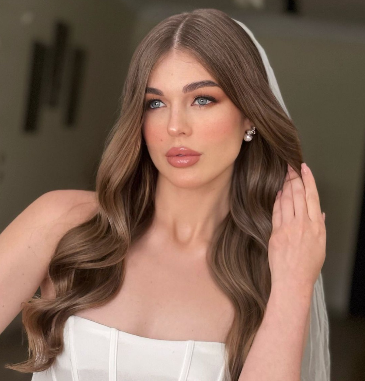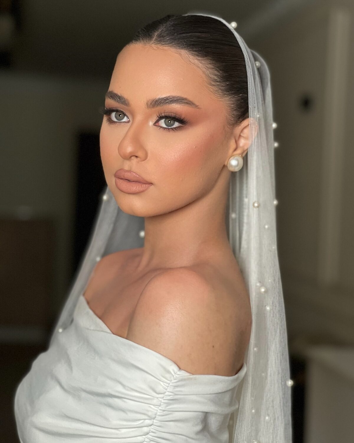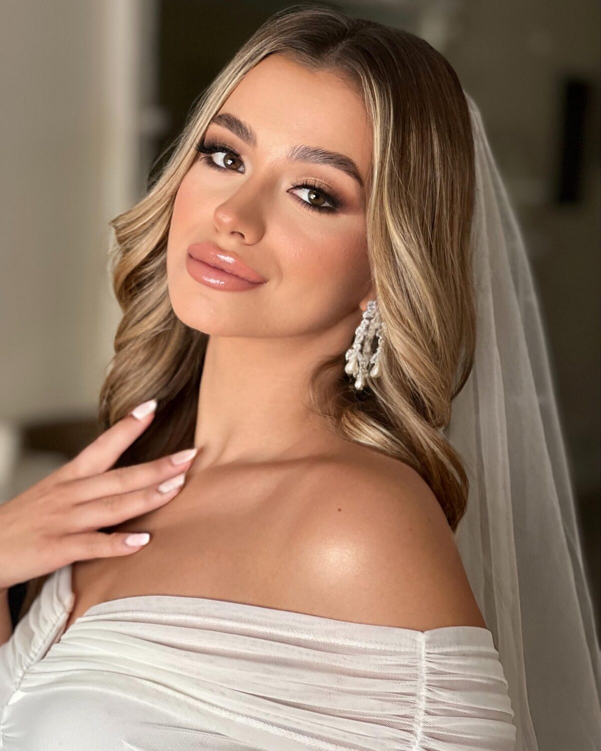 ولو العروسة حابة لوك جريء أكتر، هدير بتعرف تعمل التوازن بين الألوان القوية والهدوء. ممكن تستخدم سموكي بدرجات رمادية أو نحاسية، وتختار روج بدرجة قوية زي الأحمر أو الموف الغامق، لكن دايمًا بتحافظ على شكل أنيق ومتناسق مع باقي الملامح. عندها حس فني عالي جدًا في توزيع الهايلايتر والكونتور بطريقة تبرز تفاصيل الوجه بخفة من غير ما تبان خطوط أو تكتلات.