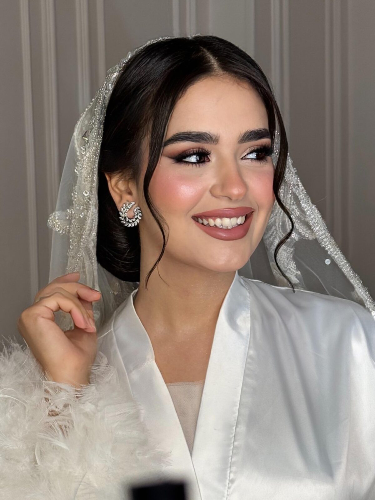 مكياج العيون مع هايدي ليه أسلوب خاص. بتحب تشتغل بالدرجات الترابية والبيج لو العروسة عايزة إطلالة هادية، وبتتقن الألوان الداكنة والسموكي بدرجات الرمادي والبني لو العروسة حابة شكل جريء أكتر. كمان بتركب رموش صناعية خفيفة علشان تدي للعين جاذبية وتوسع شكلها من غير ما تبقى تقيلة.