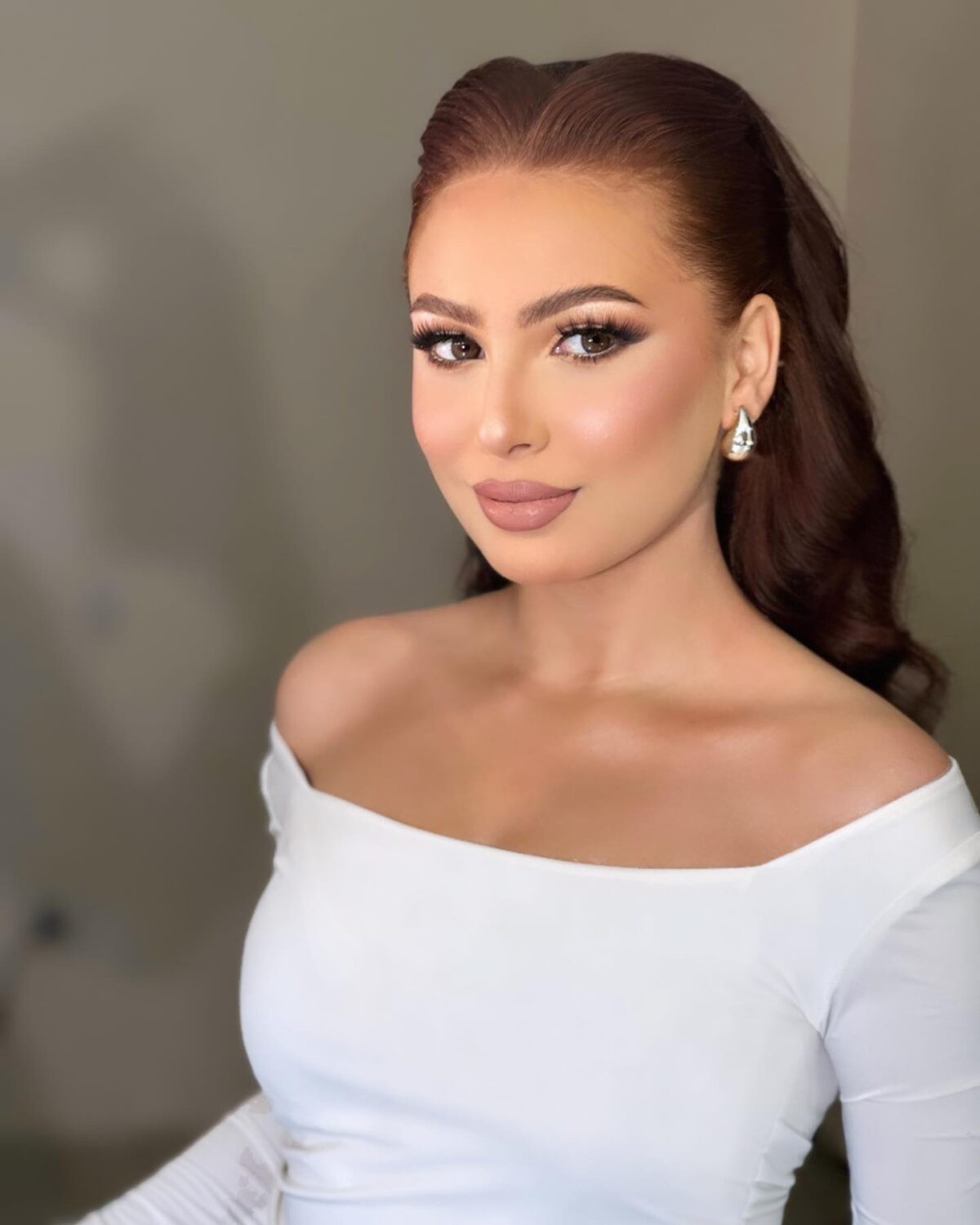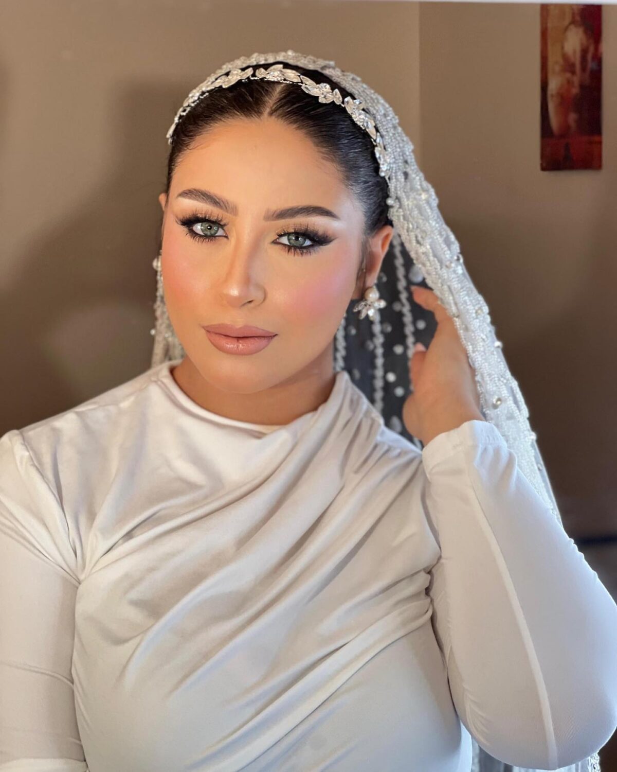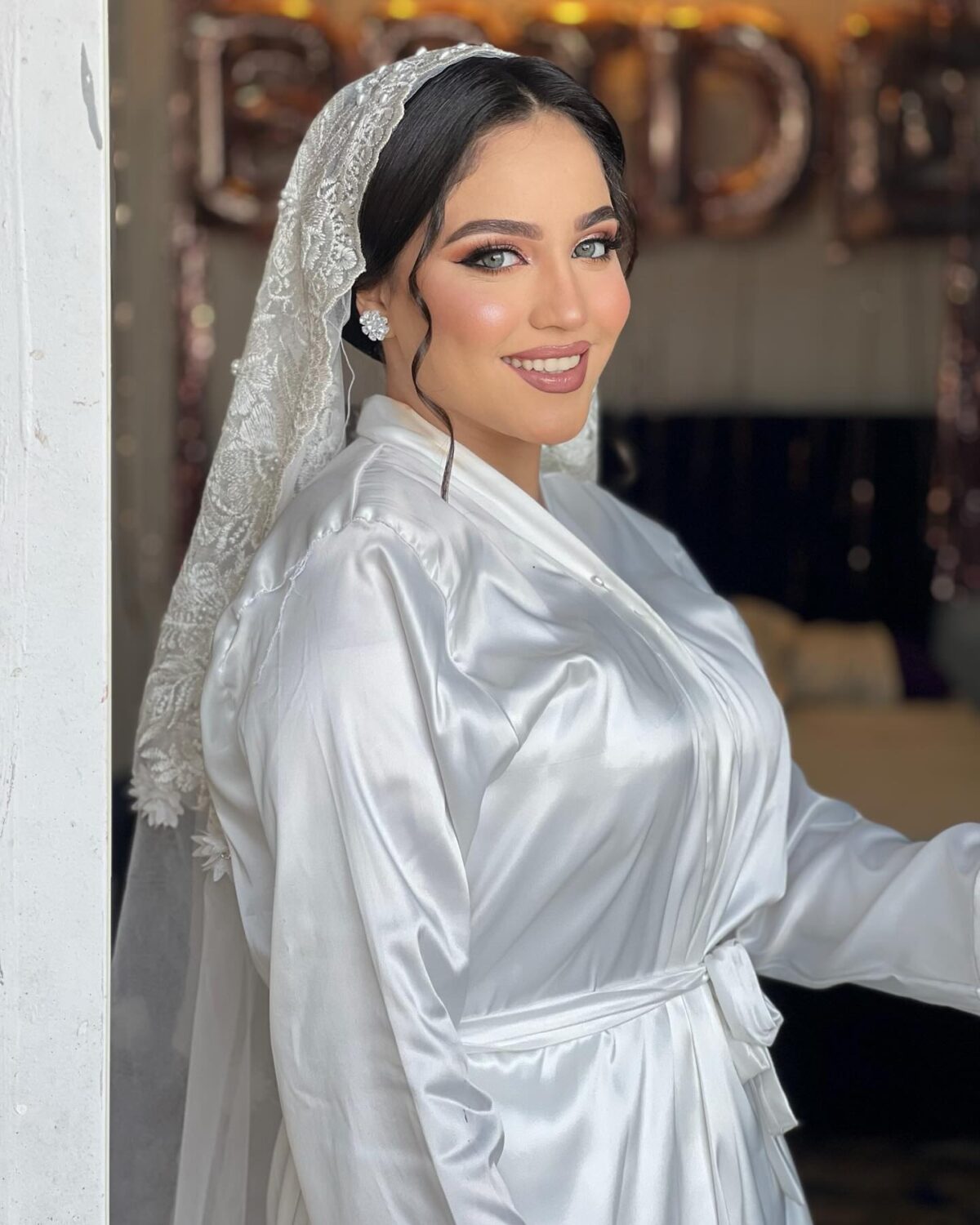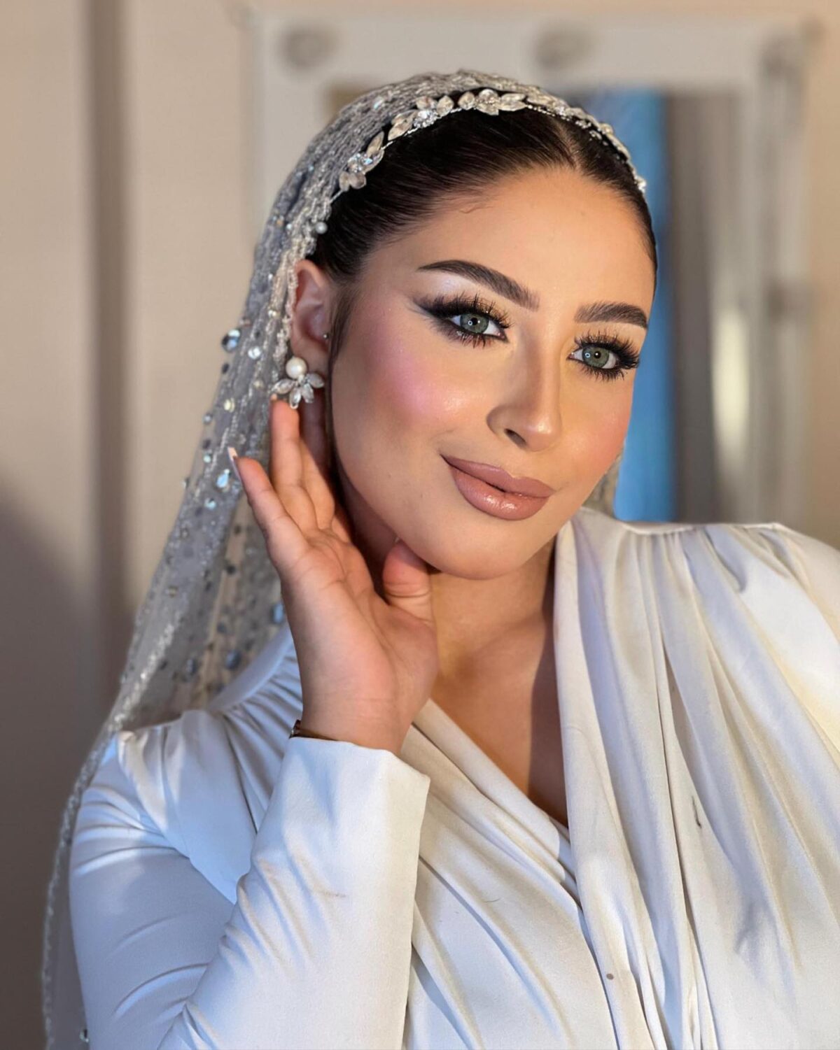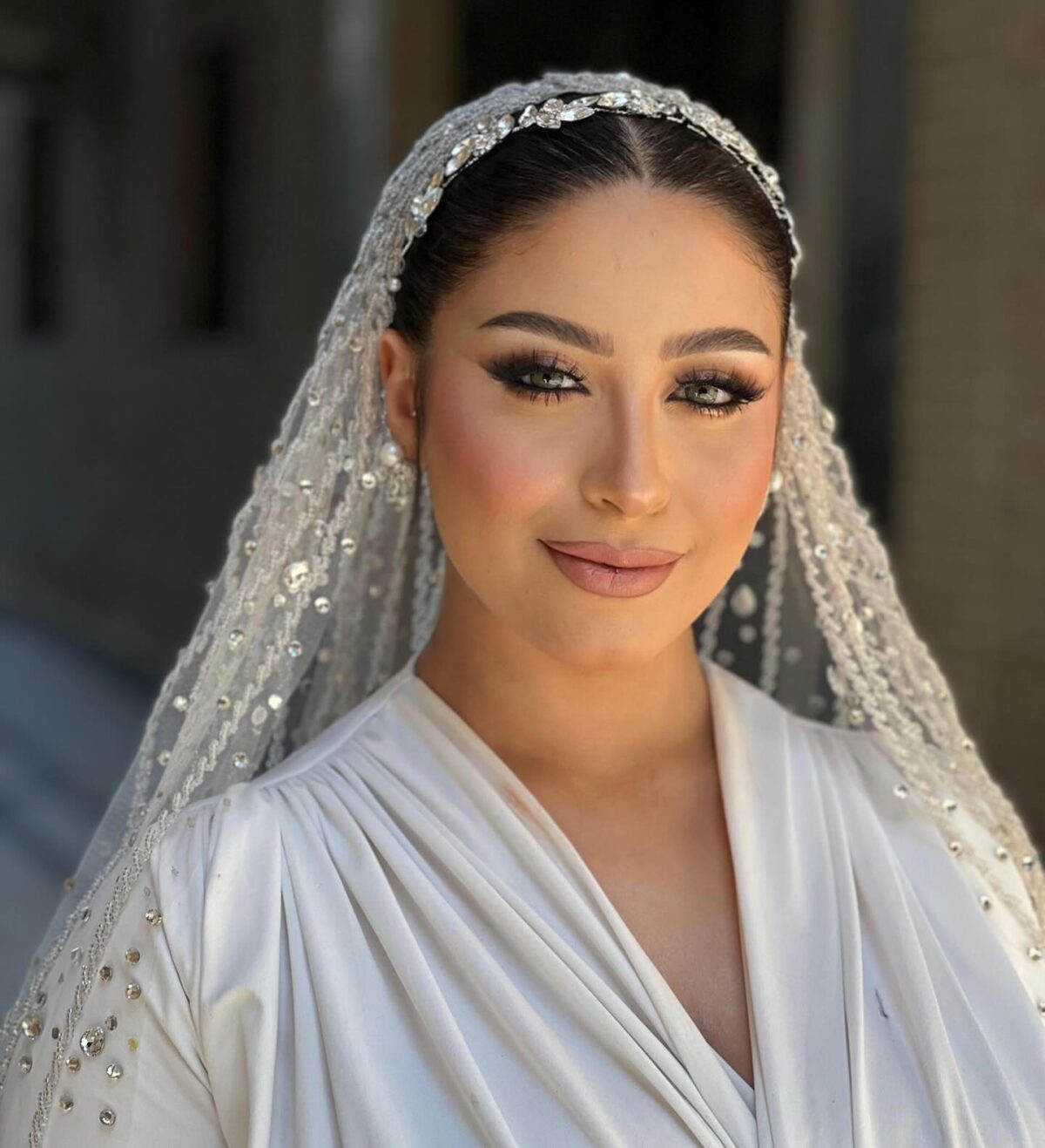 ولو العروسة حابة لوك جريء أكتر، مي بتعرف تعمل التوازن الصح بين الجرأة والهدوء. ممكن تستخدم سموكي ناعم بدرجات رمادية أو نحاسية، وتختار روج قوي زي الأحمر الكلاسيكي أو النبيتي، بس دايمًا بتحافظ إن الشكل النهائي يكون راقي ومناسب للون البشرة والإضاءة. عندها إحساس عالي جدًا في توزيع الكونتور والهايلايتر بطريقة تبرز الملامح وتدي إشراقة خفيفة من غير ما تبان خطوط أو مبالغة.