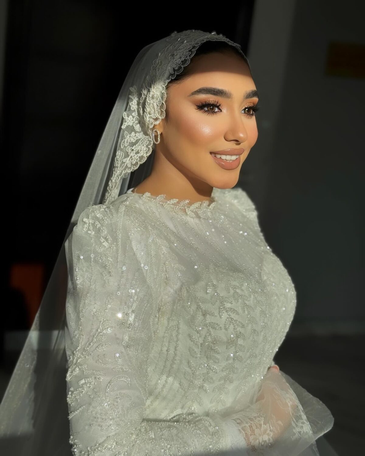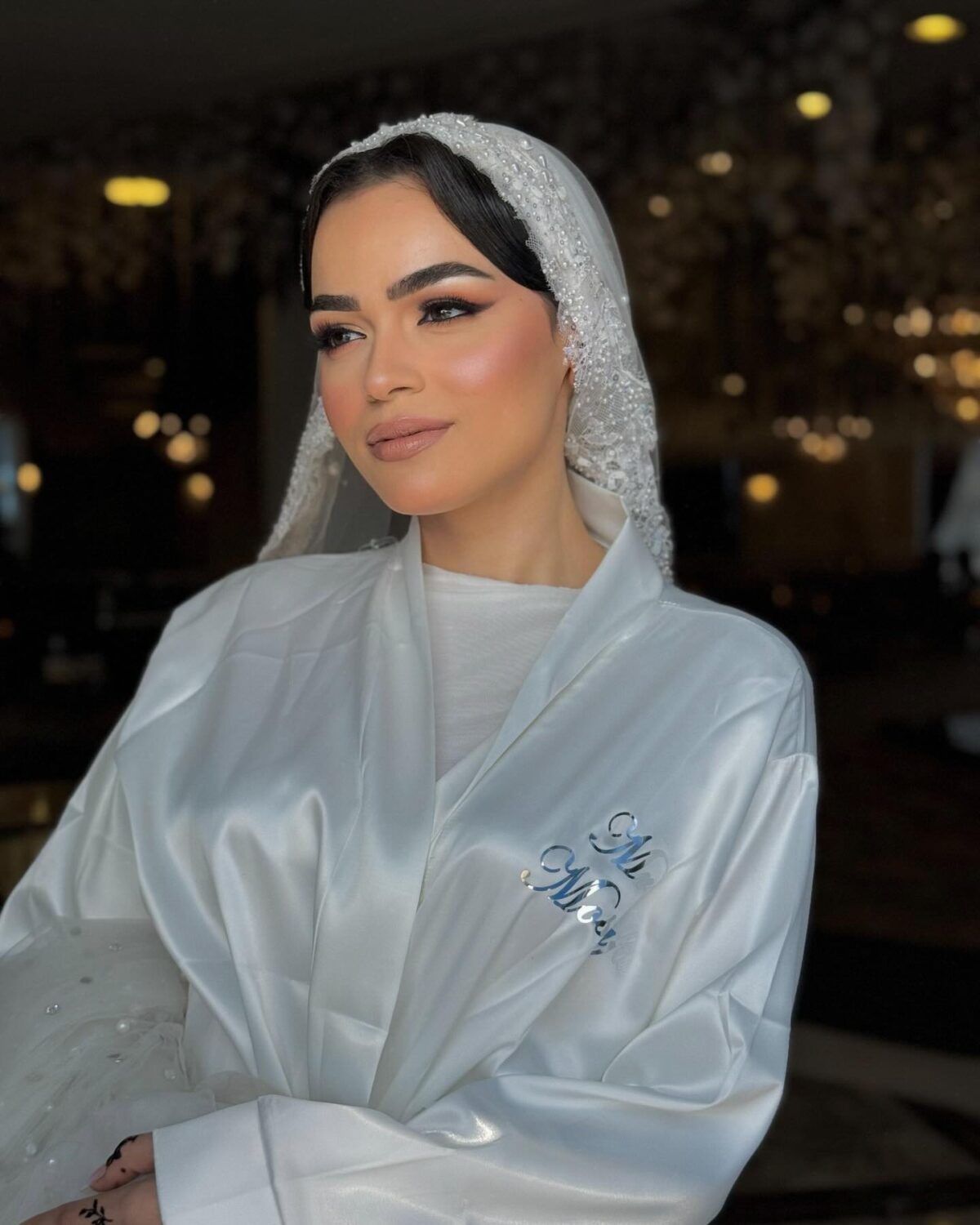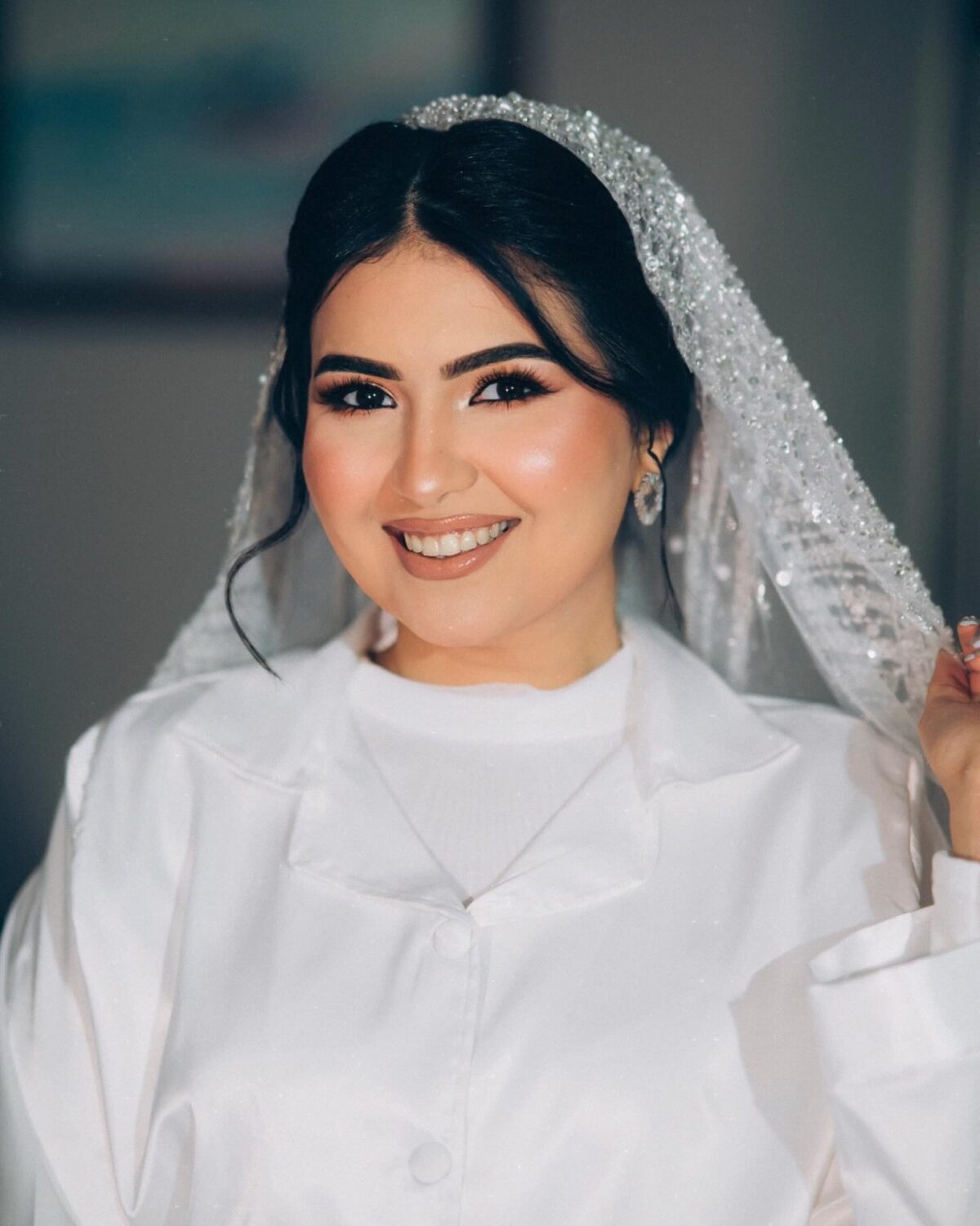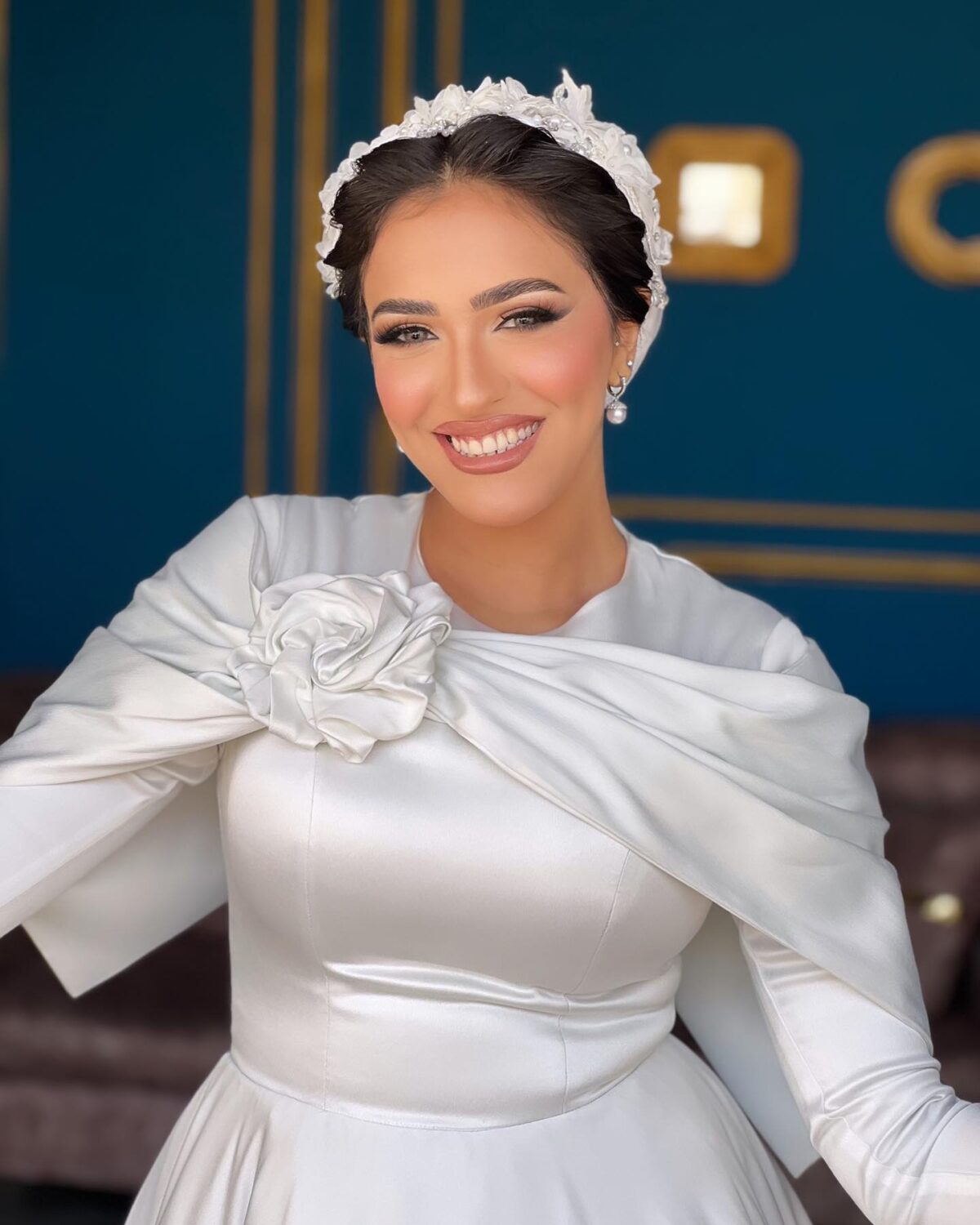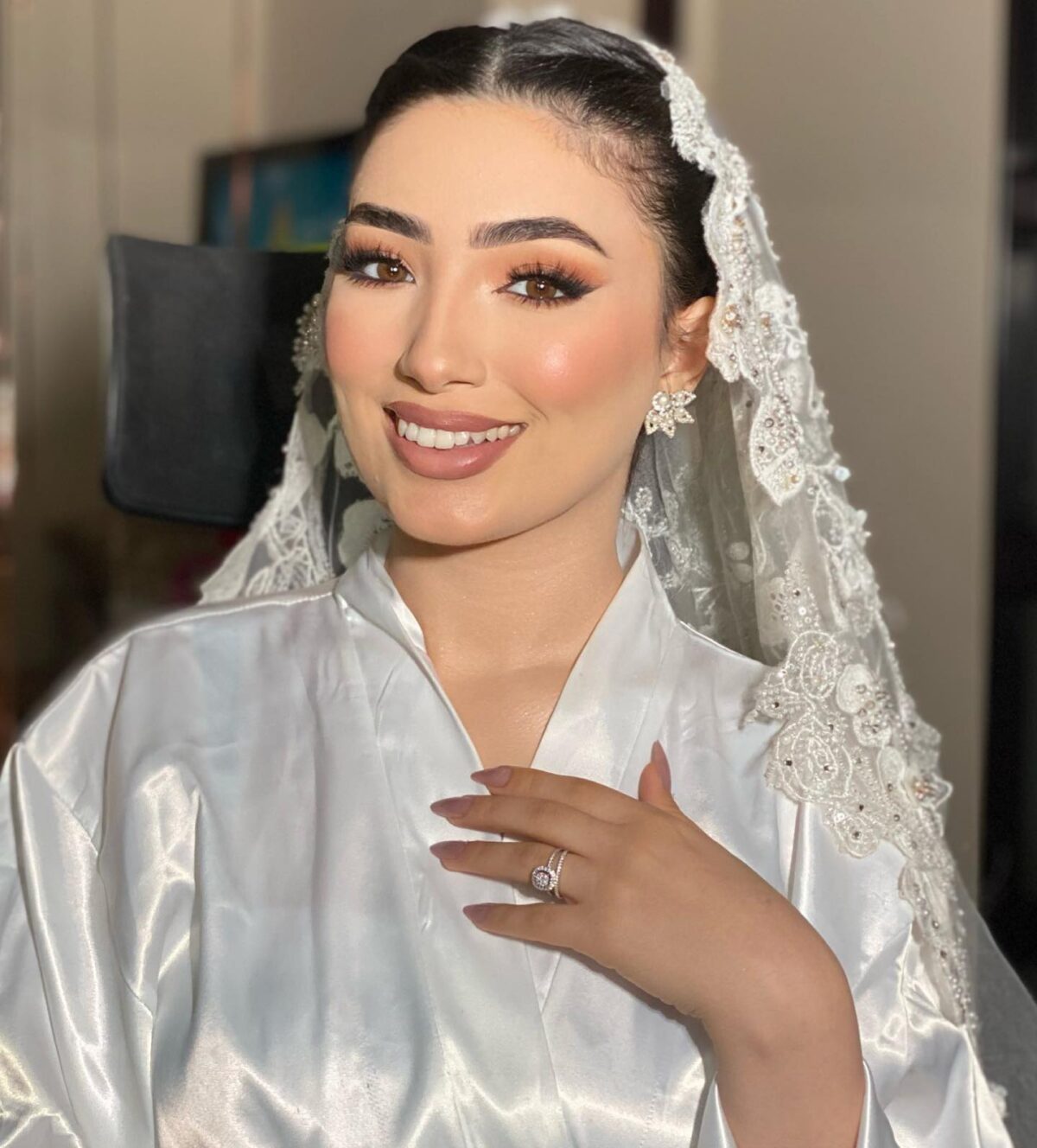 ولو العروسة حابة لوك جريء أكتر، مي بتعرف تعمل التوازن الصح بين الجرأة والهدوء. ممكن تستخدم سموكي ناعم بدرجات رمادية أو نحاسية، وتختار روج قوي زي الأحمر الكلاسيكي أو النبيتي، بس دايمًا بتحافظ إن الشكل النهائي يكون راقي ومناسب للون البشرة والإضاءة. عندها إحساس عالي جدًا في توزيع الكونتور والهايلايتر بطريقة تبرز الملامح وتدي إشراقة خفيفة من غير ما تبان خطوط أو مبالغة.