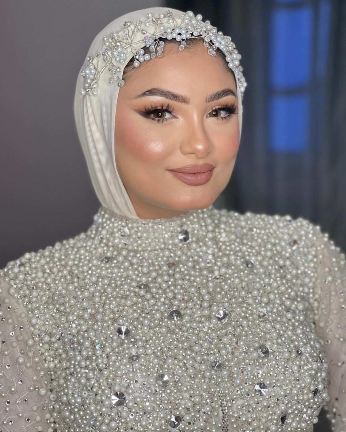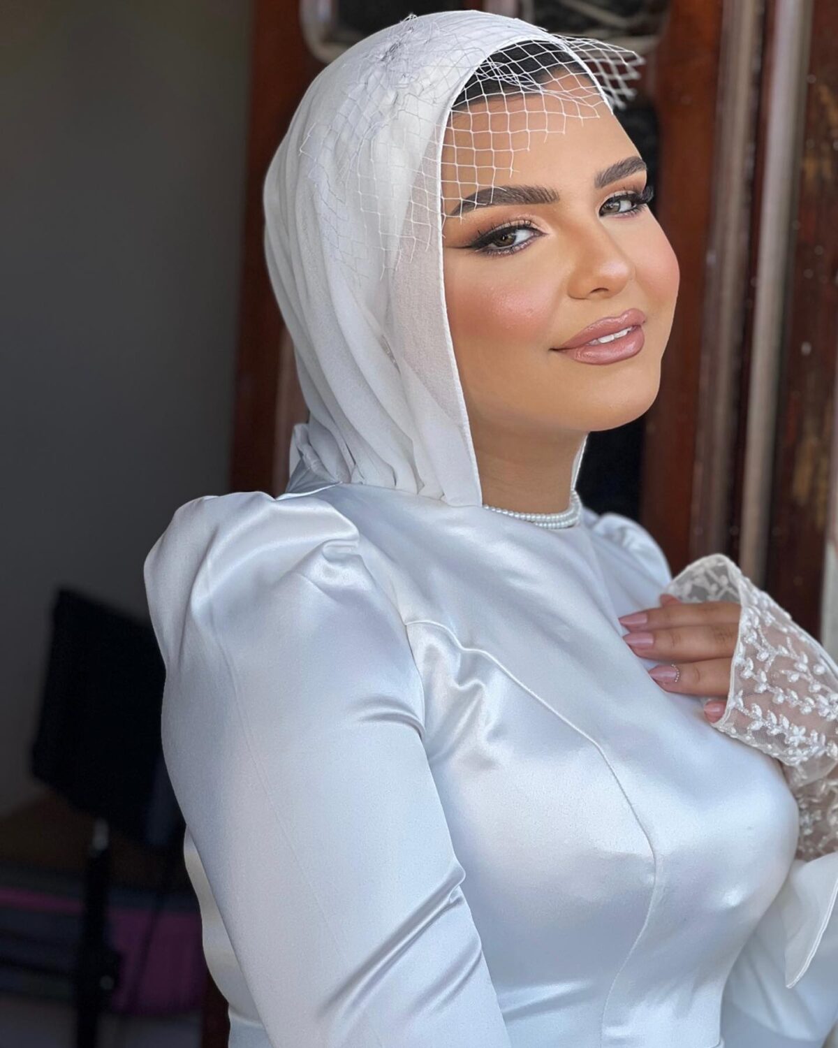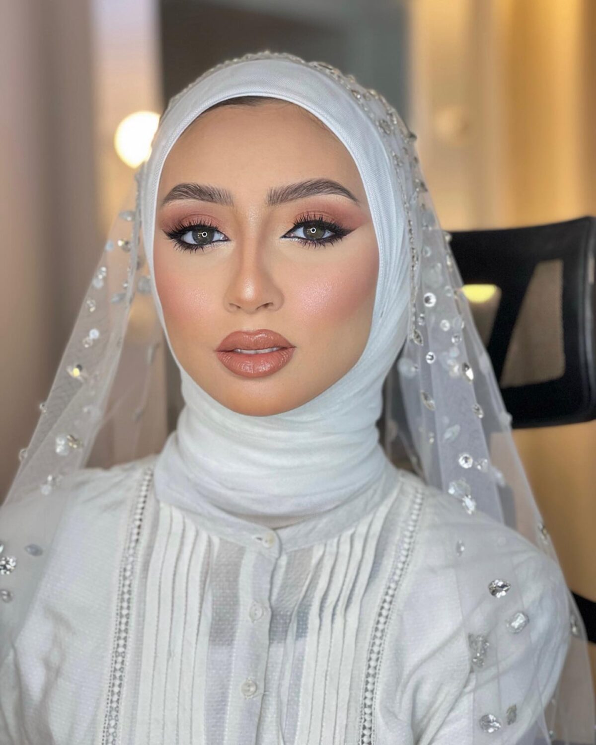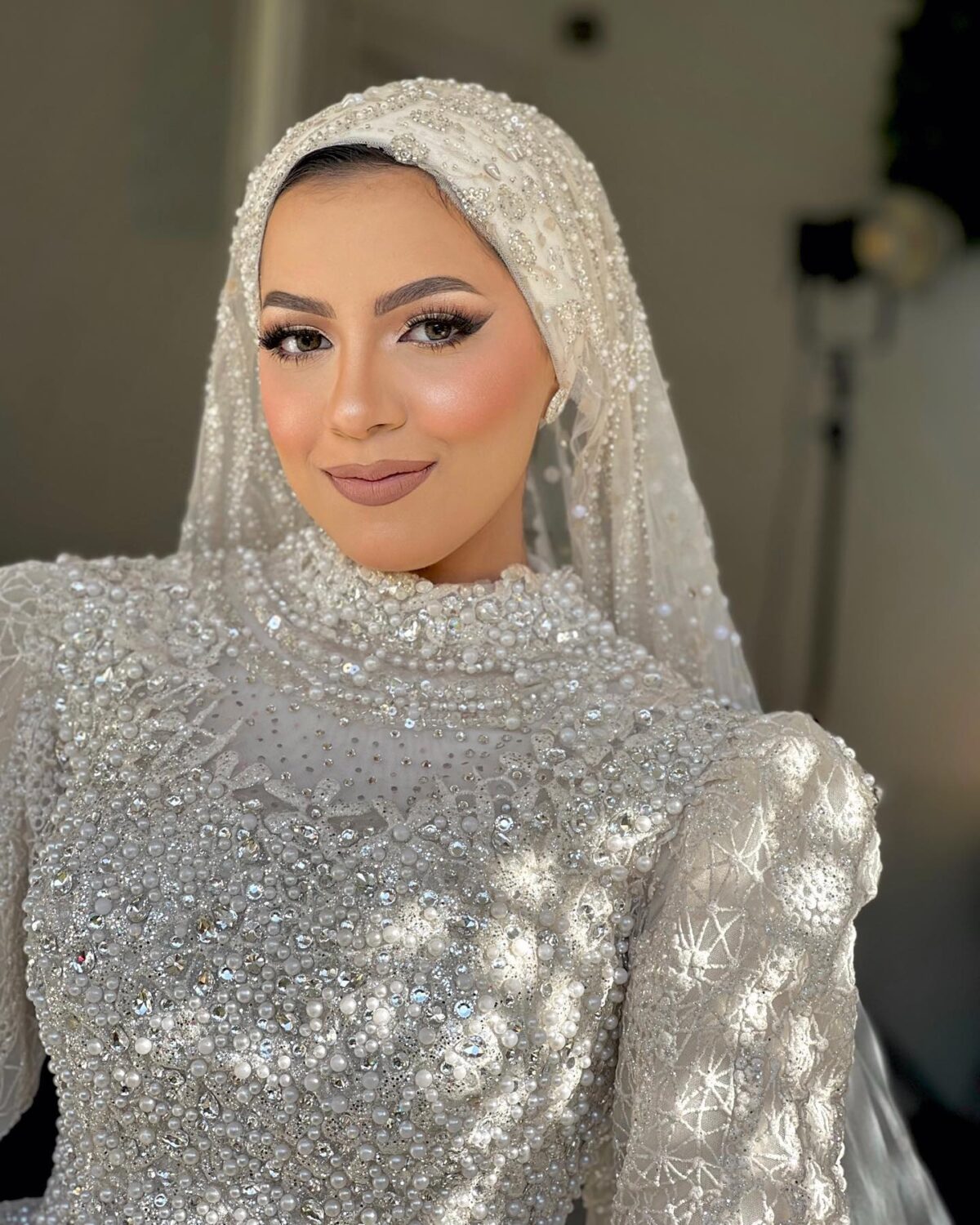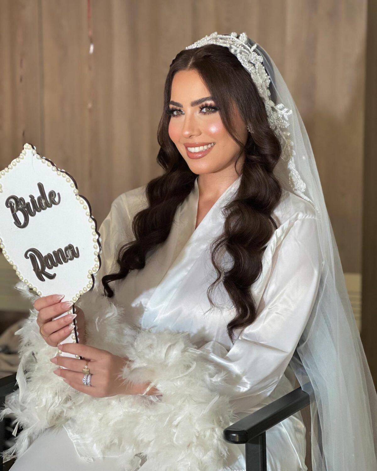 ولو العروسة حابة لوك جريء أكتر، مي بتعرف تعمل التوازن الصح بين الجرأة والهدوء. ممكن تستخدم سموكي ناعم بدرجات رمادية أو نحاسية، وتختار روج قوي زي الأحمر الكلاسيكي أو النبيتي، بس دايمًا بتحافظ إن الشكل النهائي يكون راقي ومناسب للون البشرة والإضاءة. عندها إحساس عالي جدًا في توزيع الكونتور والهايلايتر بطريقة تبرز الملامح وتدي إشراقة خفيفة من غير ما تبان خطوط أو مبالغة.