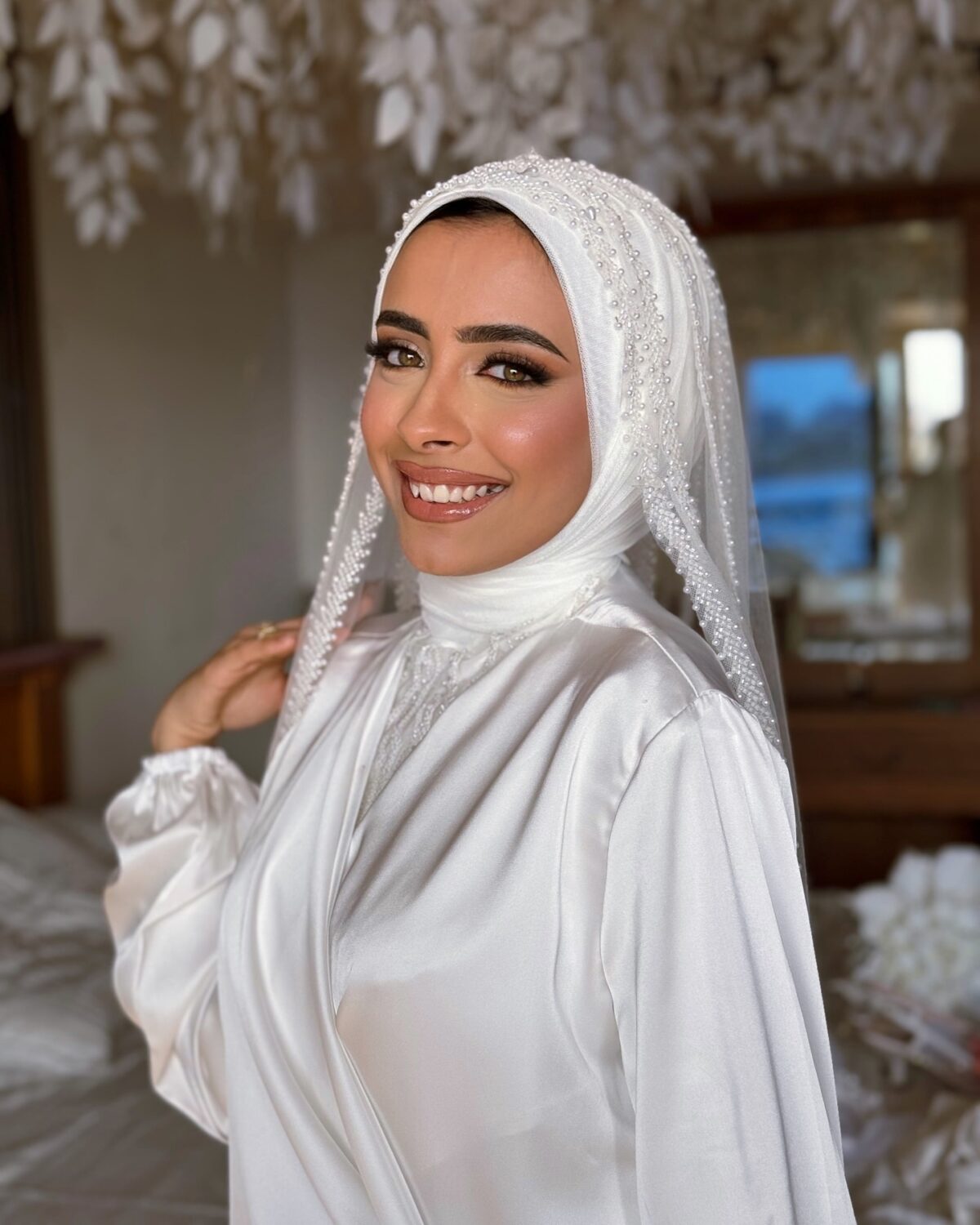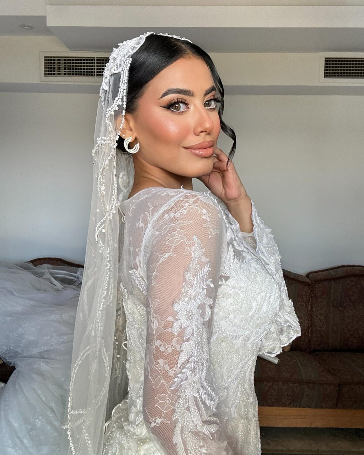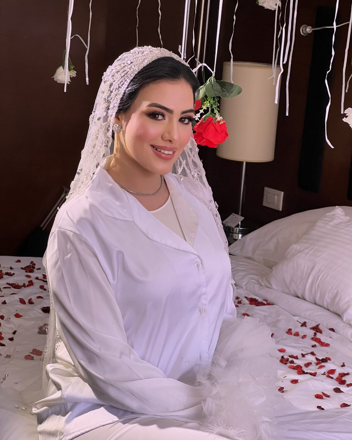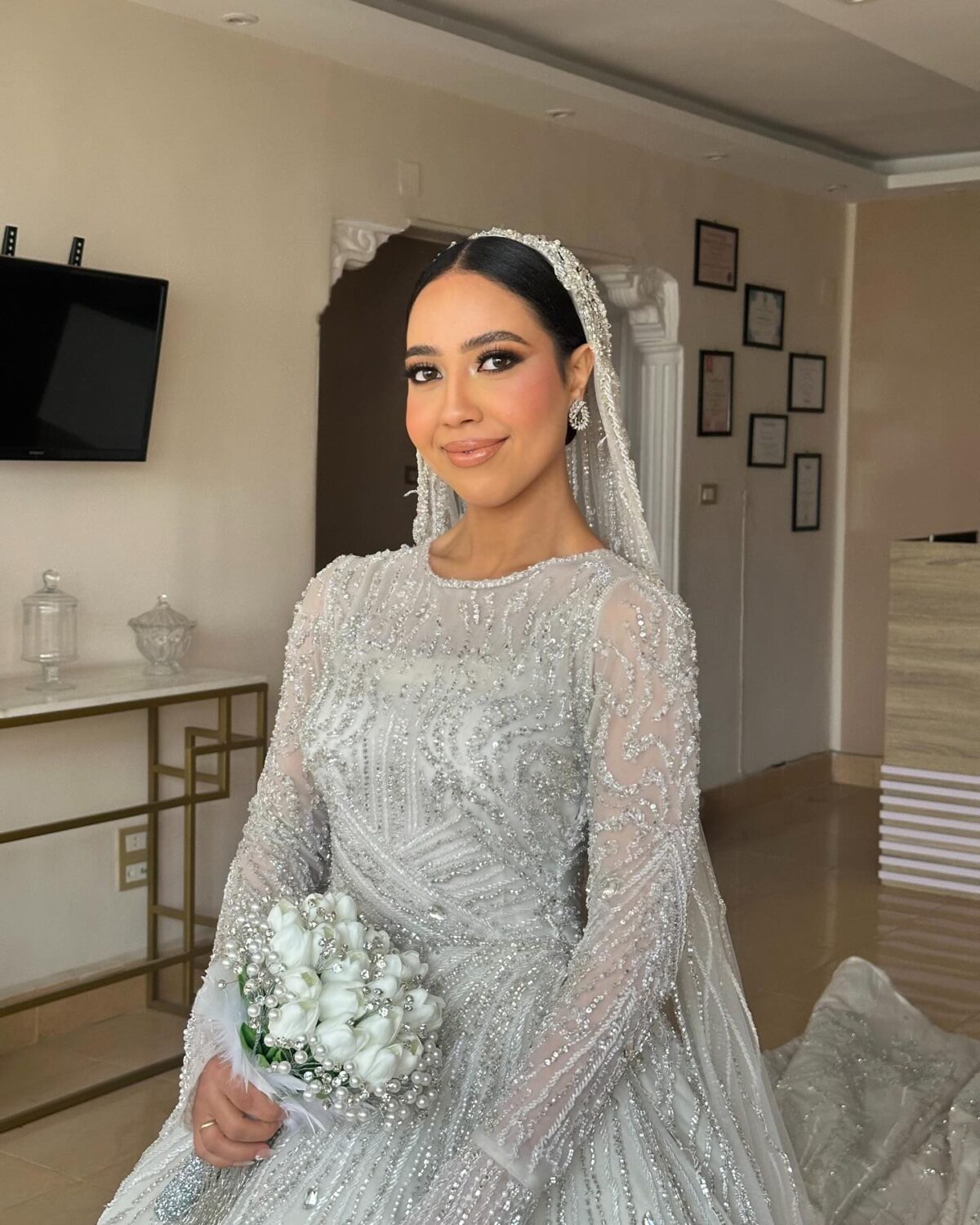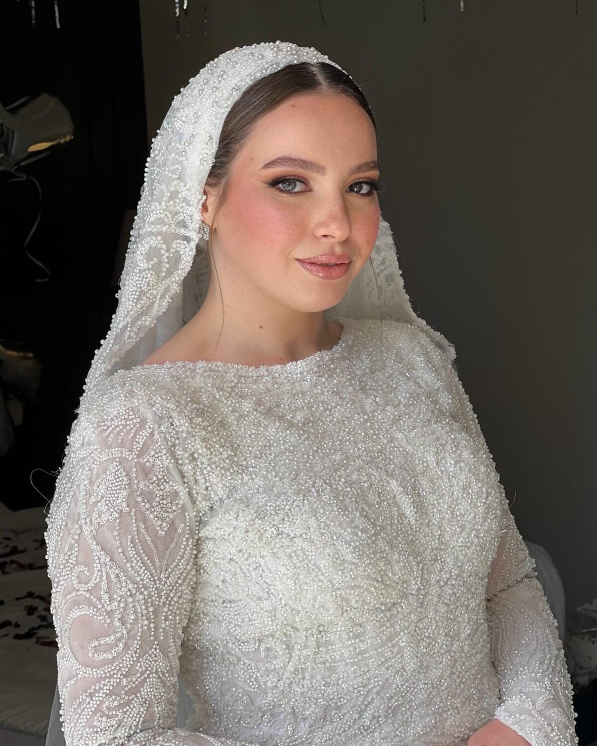 أما لو العروسة أو العميلة حابة لوك أقوى، ندى بتعرف توازن بين القوة والرقي. ممكن تعمل سموكي ناعم بدرجات رمادية أو نحاسية، وتختار لون شفايف أقوى زي الأحمر الكلاسيكي أو الموف، لكن دايمًا بتحافظ إن الشكل النهائي يفضل ناعم ومناسب للملامح والإضاءة. عندها إحساس فني عالي جدًا في توزيع الكونتور والهايلايتر بطريقة ناعمة تدي تحديد خفيف للملامح وتخليها مشعة من غير مبالغة.