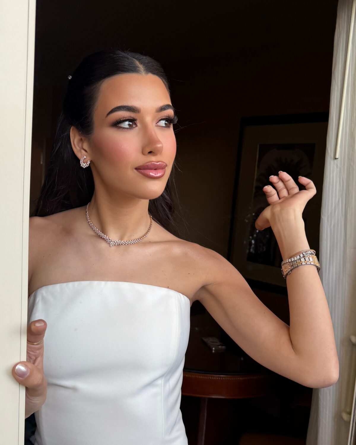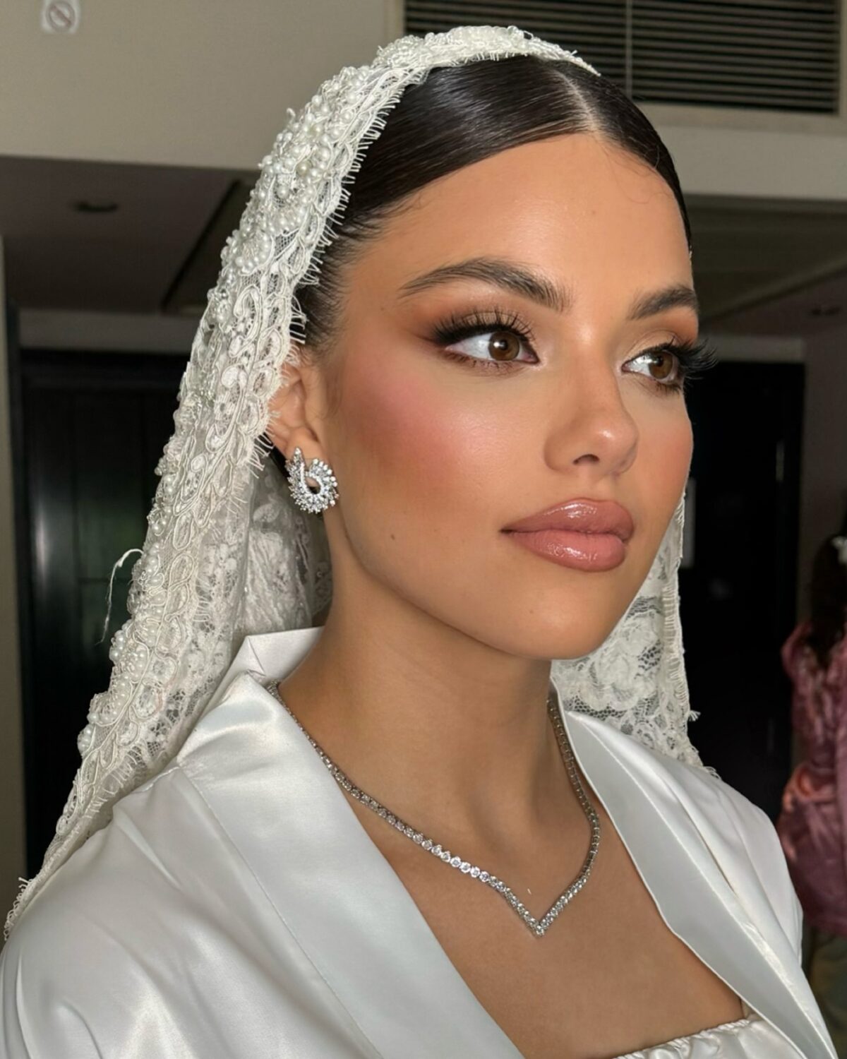ولو العروسة أو العميلة حابة لوك أقوى، شمس بتعرف تعمل التوازن بين الألوان القوية والهدوء. ممكن تستخدم سموكي ناعم بدرجات رمادية أو نحاسية، وتختار لون شفايف قوي زي الأحمر أو النبيتي، بس دايمًا بتحافظ إن الشكل النهائي يفضل شيك ومتناسق. عندها حس فني عالي جدًا في توزيع الكونتور والهايلايتر بطريقة تبرز الملامح وتدي إشراقة ناعمة للوجه.