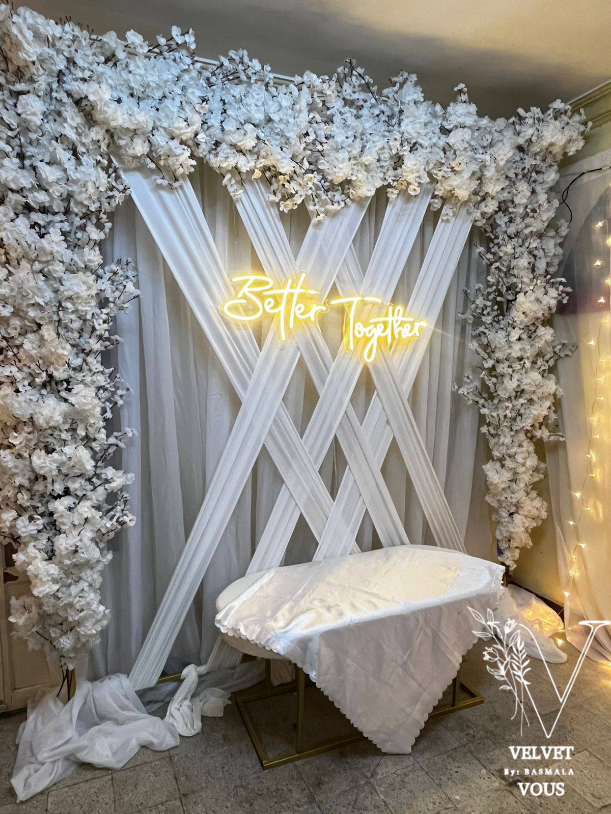في شغل الديكور، Velvet Vows بيهتموا بالتوازن أكتر من الكثرة. الكوشة بتتعمل على قد القاعة عشان الصور تبقى متناسقة، الطاولات بيتظبط عليها ديكور بسيط وشيك من غير زحمة، وركن التصوير بيتنفذ على نفس الثيم علشان الصور كلها تبقى متناغمة. الإضاءة عندهم مش عنصر إضافي، لكنها جزء أساسي من التصميم، بتتوزع بشكل مدروس يدي عمق ويبرز جمال القاعة.