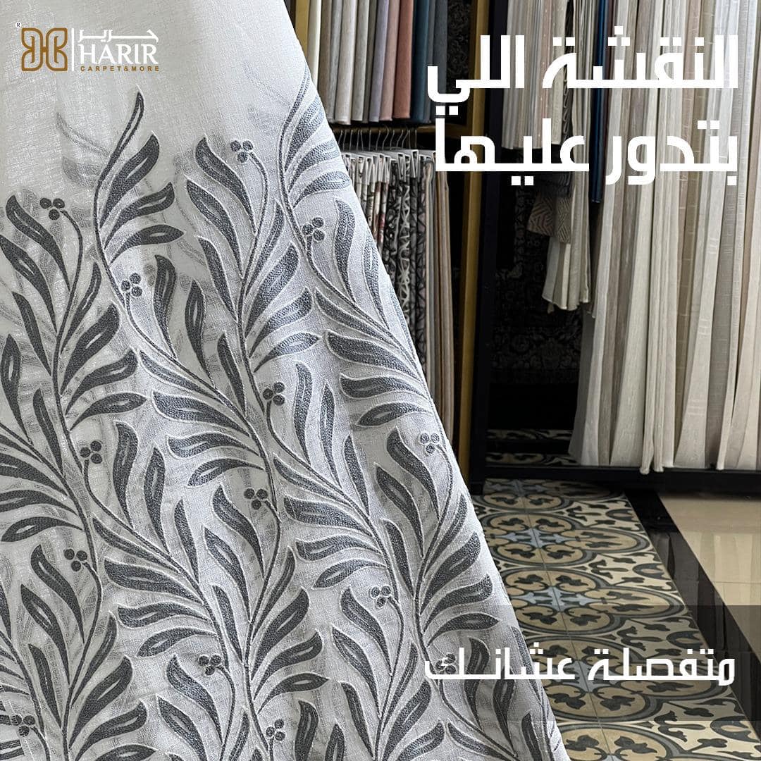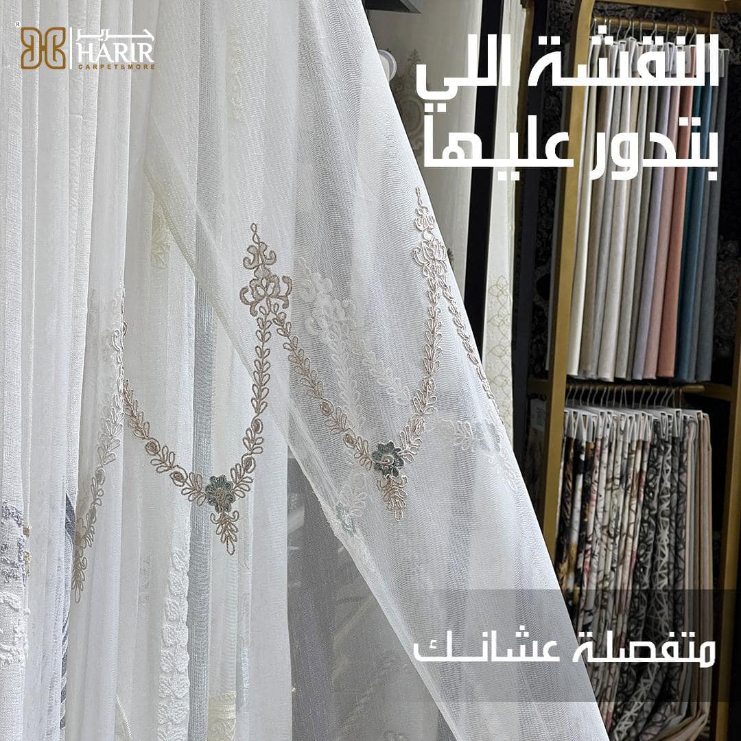 من أول لحظة في محل Harir هتحس إنك في مكان معموله بعناية وذوق. طريقة عرض الأقمشة هناك منظمة جدًا، والألوان متدرجة بشكل يخليك تختار براحتك وتشوف كل خامة بنفسك. عندهم مجموعة كبيرة من الأقمشة اللي تناسب كل الأذواق، سواء موديلات مودرن بسيطة وناعمة بألوان فاتحة زي الأوف وايت والرمادي والبيج، أو كلاسيكية فيها لمسة فخامة بخامات زي القطيفة والحرير والتل المطرز. كل خامة هناك مختارة بعناية علشان تضيف للمكان لمسة رقي ودفا.