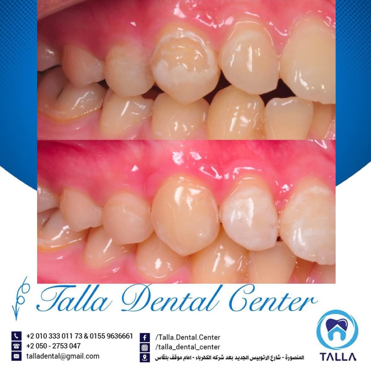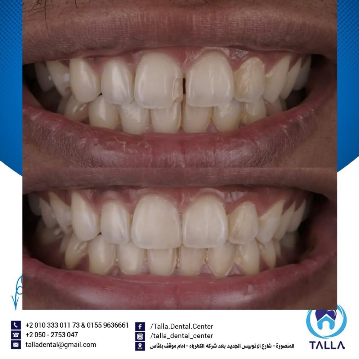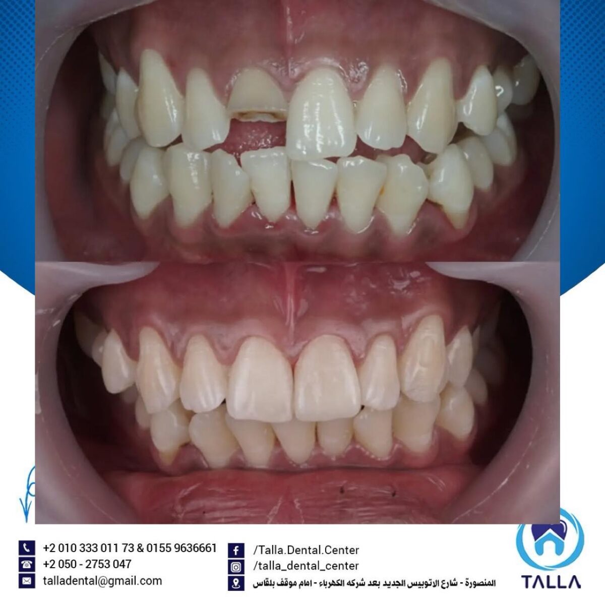 Talla Dental Center كمان بتهتم بعلاج اللثة وتنضيفها من الالتهابات والتصبغات، لأن شكل اللثة جزء أساسي من جمال الابتسامة. ولو الحالة محتاجة تقويم، سواء معدني أو شفاف، العيادة بتوفر أحدث الأنواع اللي بتكون مريحة ومش بتأثر على شكل الابتسامة طول فترة العلاج.