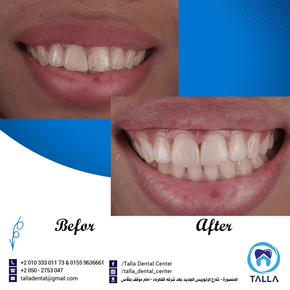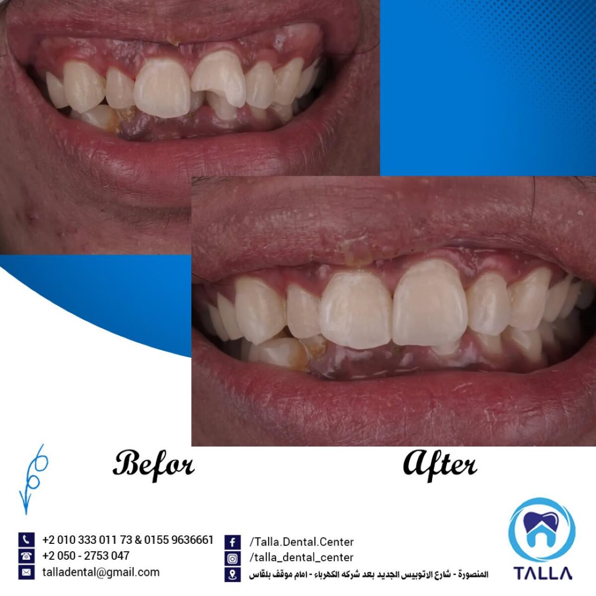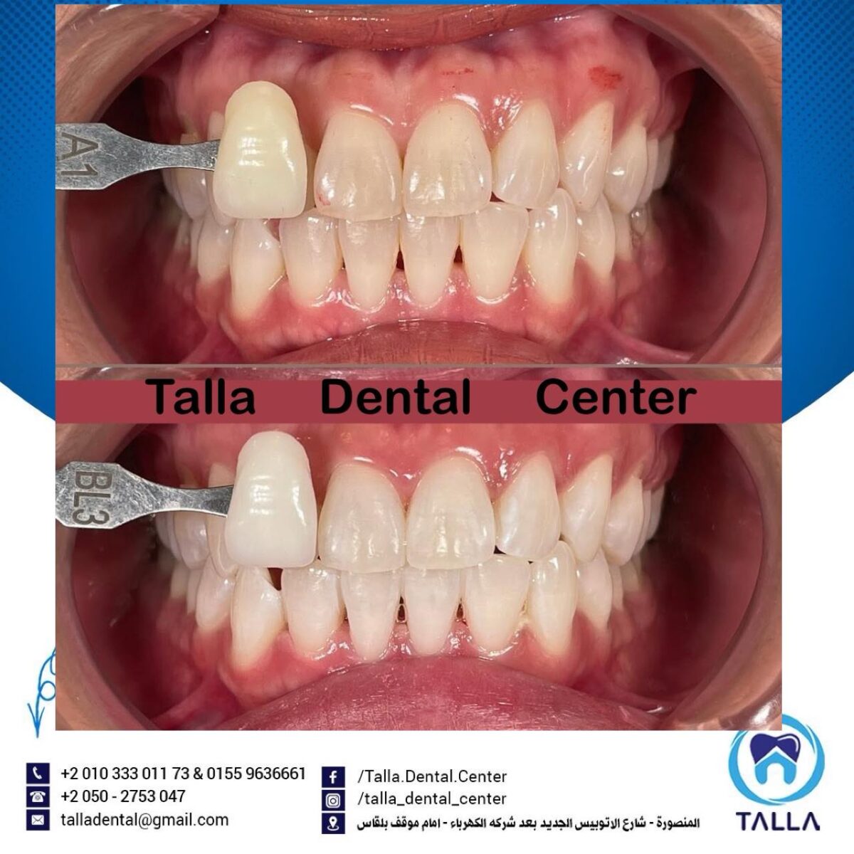 Talla Dental Center كمان بتهتم بعلاج اللثة وتنضيفها من الالتهابات والتصبغات، لأن شكل اللثة جزء أساسي من جمال الابتسامة. ولو الحالة محتاجة تقويم، سواء معدني أو شفاف، العيادة بتوفر أحدث الأنواع اللي بتكون مريحة ومش بتأثر على شكل الابتسامة طول فترة العلاج.