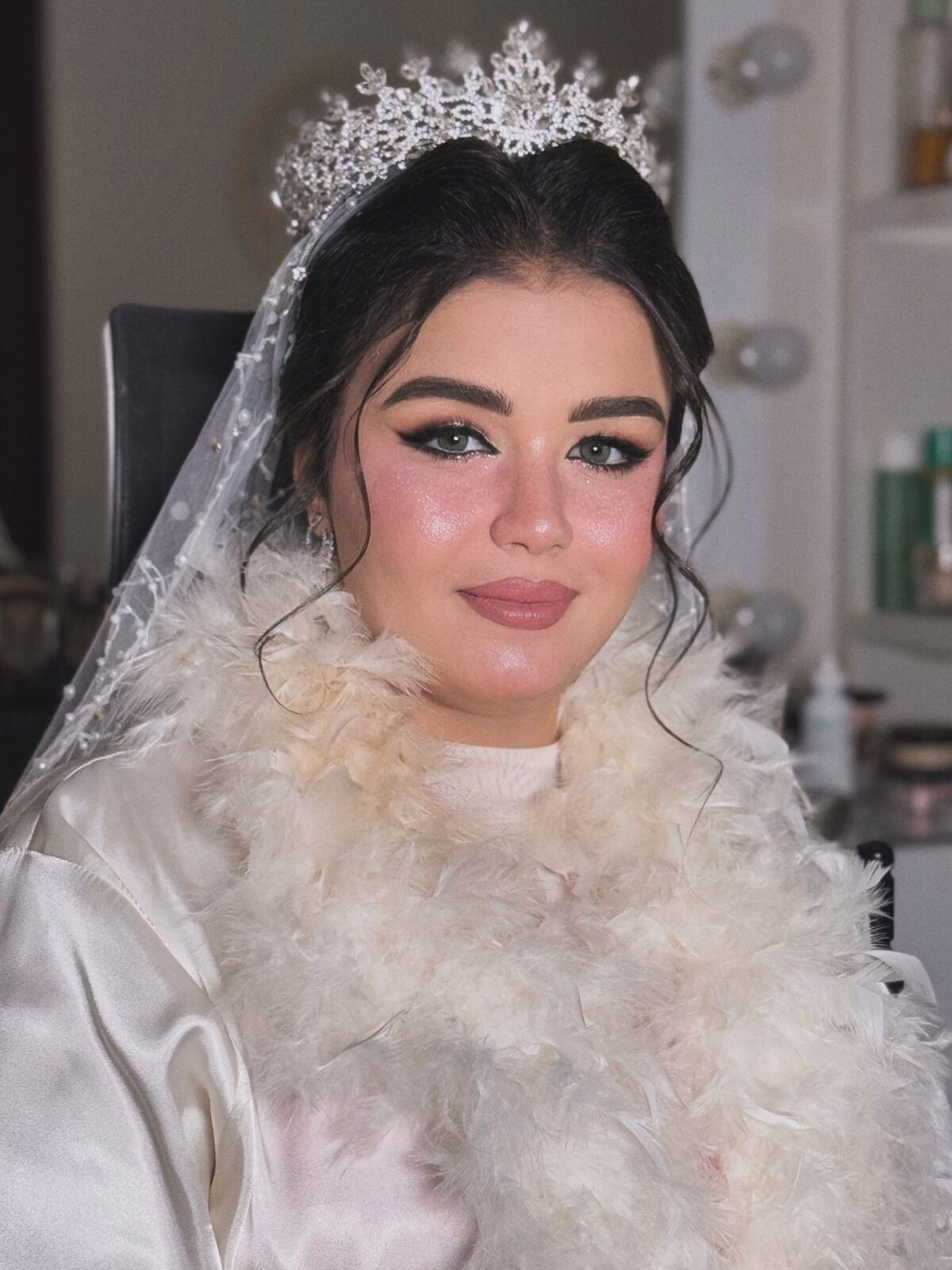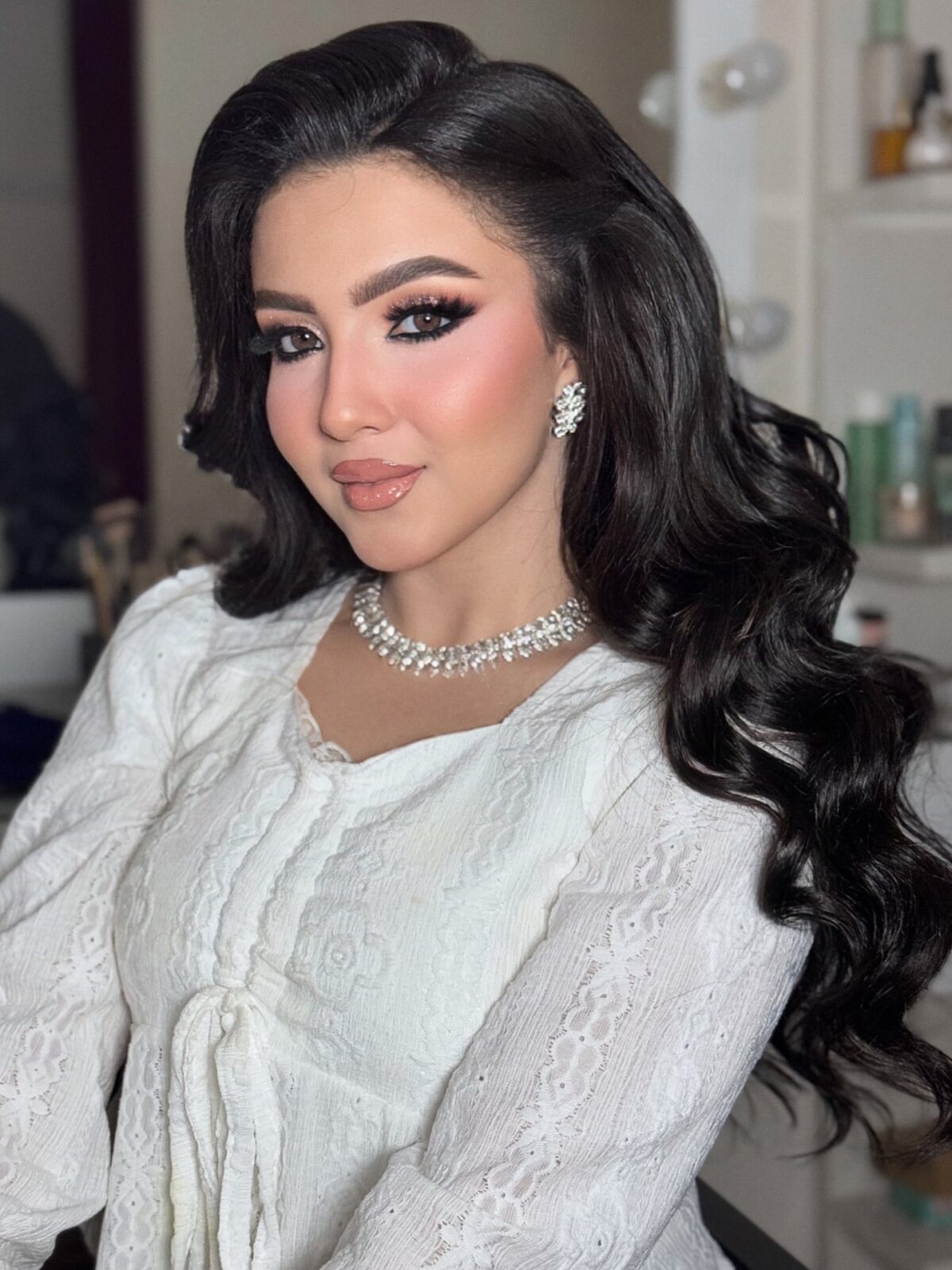 ولو العروسة أو العميلة حابة لوك أقوى، سارة بتعرف توازن بين الجرأة والرقة. ممكن تستخدم سموكي ناعم بدرجات رمادية أو برونزية، وتختار لون شفايف قوي زي الأحمر أو الموف، لكن دايمًا بتحافظ إن الشكل النهائي يفضل أنيق ومتناسق مع الملامح والإضاءة. عندها إحساس فني عالي جدًا في توزيع الكونتور والهايلايتر بطريقة ناعمة تبرز الملامح وتدي إشراقة خفيفة من غير مبالغة.