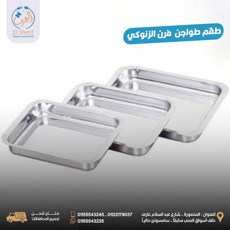 في قسم الطهي، الشريف بيعرض قدور ومقالي ستانلس ستيل مقاوم للصدأ بمقاسات مختلفة، وكمان مقالي غير لاصقة بخامات متينة تتحمل الاستخدام اليومي وتخلي التنضيف أسهل. كمان فيه صواني فرن ألومنيوم، قوالب سيليكون للحلويات، وأواني زجاج حراري تقدّم فيها الأكل بشكل عملي وأنيق.