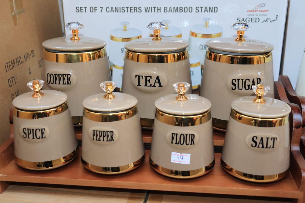 أما قسم السفرة والتقديم، فمتنوع جدًا. أطقم أطباق بورسلين وزجاج بألوان ونقوش بسيطة تناسب المودرن والكلاسيك، وكاسات عصير وفناجين شاي وقهوة. كمان فيه صواني تقديم وأباريق عملية وأنيقة تدي شكل متكامل وتسهّل الضيافة سواء في المناسبات أو الروتين اليومي.