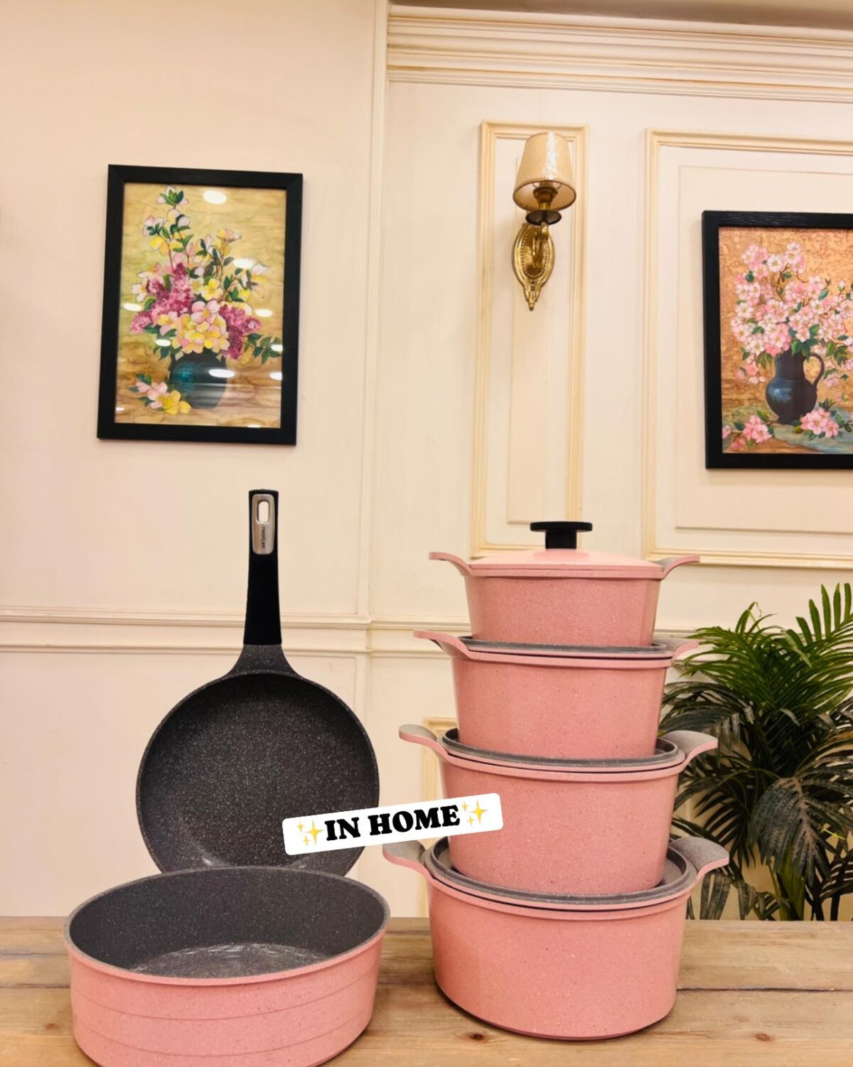 في قسم الطهي، IN HOME بيعرض قدور ومقالي ستانلس ستيل مقاوم للصدأ بأحجام متنوعة، وكمان مقالي غير لاصقة بخامات متينة بتوزّع الحرارة كويس وتنضف بسرعة. كمان فيه صواني فرن ألومنيوم سميك، قوالب سيليكون للحلويات، وأواني زجاج حراري تقدّم فيها الأكل مباشرة على السفرة من غير ما تغيّر وعاء.