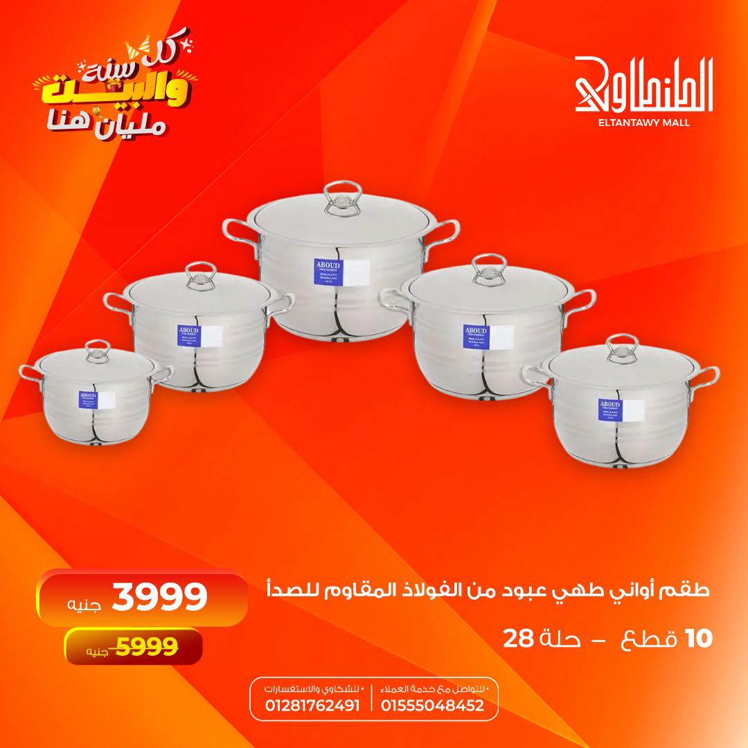 في قسم الطهي، الطنطاوي بيعرض قدور ومقالي ستانلس ستيل مقاوم للصدأ بمقاسات مختلفة، ومعاها مقالي غير لاصقة بخامات متينة توزّع الحرارة كويس وتخلي التنضيف أسهل. كمان فيه صواني فرن ألومنيوم، قوالب سيليكون للحلويات، وأواني زجاج حراري تنفع للتحضير والتقديم مباشرة.