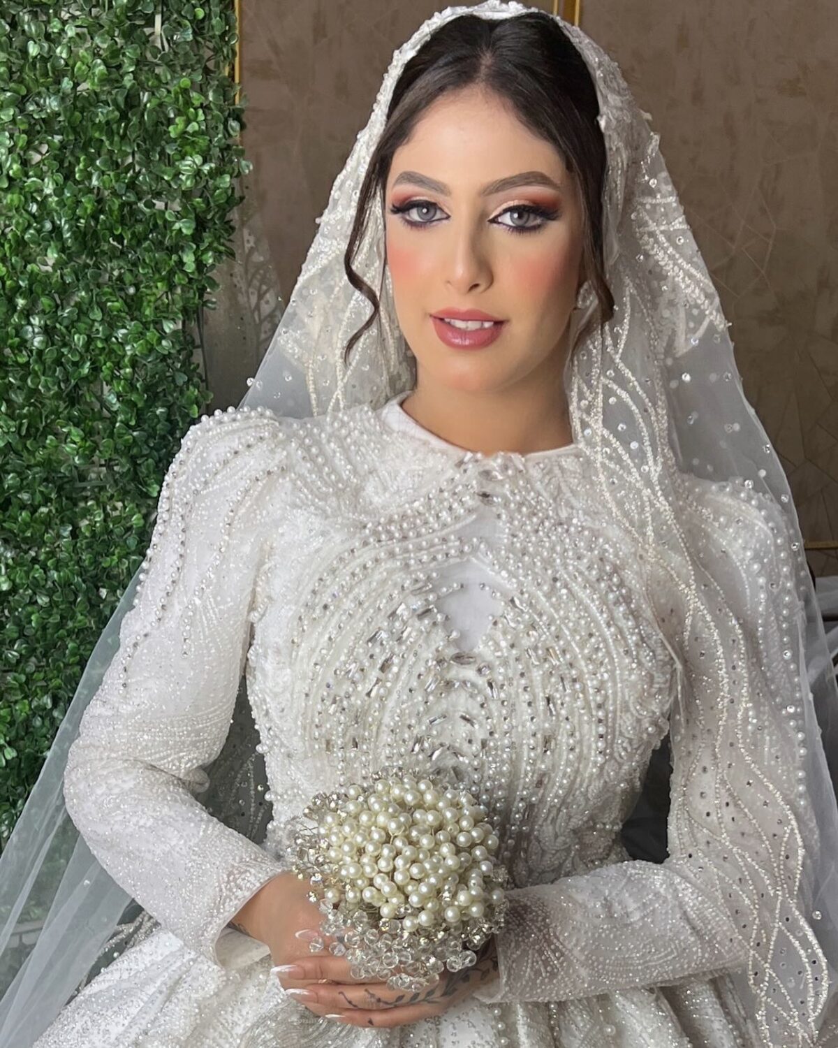 ولو العروسة حابة لوك أقوى، إيمان بتعرف توازن بين الجرأة والأناقة. ممكن تستخدم سموكي بدرجات رمادية أو نحاسية مع روج جريء زي الأحمر الكلاسيكي أو الموف الغامق، بس دايمًا بتحافظ إن الشكل النهائي يكون شيك ومتناغم مع الملامح. عندها حس فني عالي جدًا في توزيع الهايلايتر والكونتور بطريقة تدي تحديد ناعم للوجه من غير خطوط واضحة.