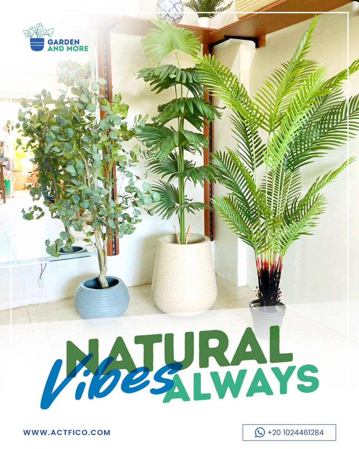 لو عندك مساحة اكبر شوف تشكيلات شجر النخيل الصناعي والواقعي اللي بيبدأ من متر ونص لغاية 4 متر والمشاتل عندنا مجهزة بستائر حديدية ومراوح تبريد عشان الشجر يفضل رطب وجاهز للتركيب. المشاتل بتاعة Garden & More اقدر اهل ديكور المنازل الكبيرة والمعايدات والفيلات