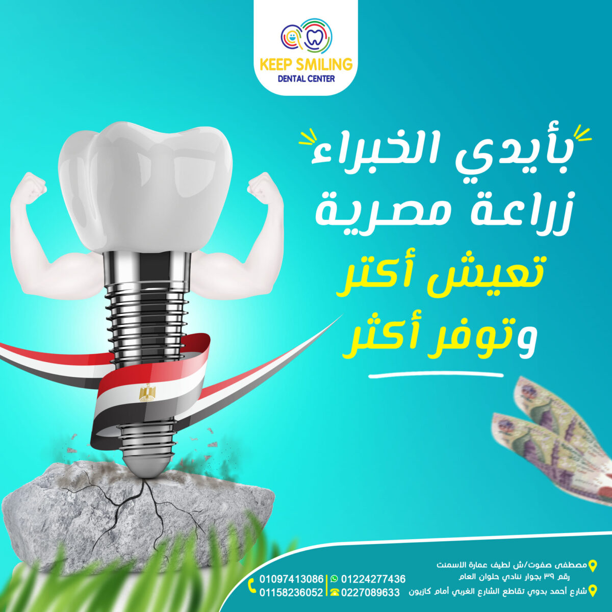 عيادة Keep Smiling Dental Clinic من الأماكن اللي فعلًا اسمها على مسمّى، لأنها بتخلي كل مريض يخرج منها وهو مبتسم وواثق في شكله. العيادة بتجمع بين الخبرة الكبيرة والدقة في الشغل والمعاملة الراقية اللي بتخلي التجربة كلها مريحة ومختلفة. المكان متكامل ومجهز بأحدث الأجهزة اللي بتساعد على التشخيص والعلاج بدقة وسرعة، وده اللي بيخلي كل زيارة هناك تجربة سهلة ومضمونة.