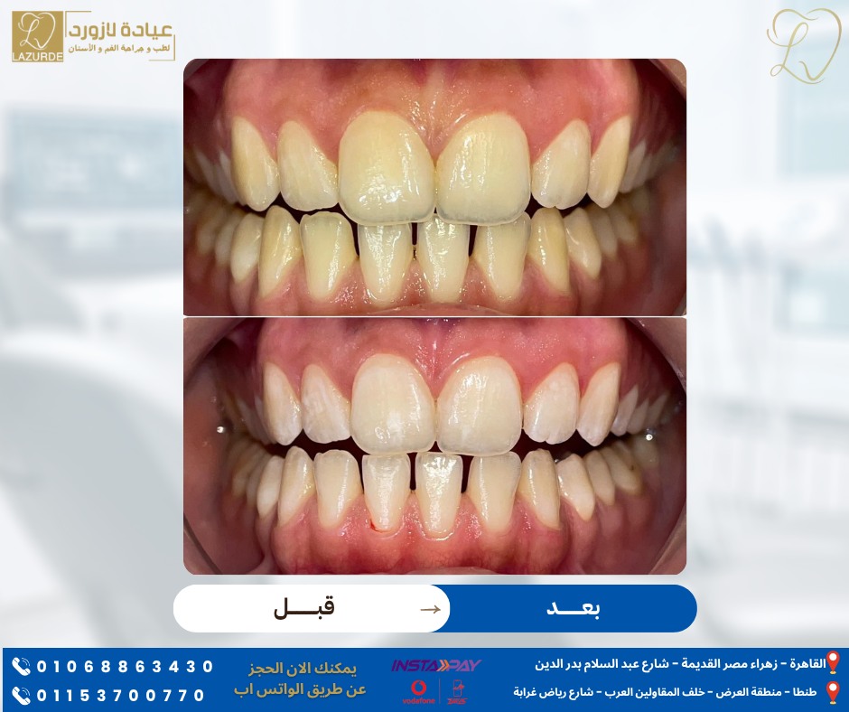كمان العيادة بتوفّر جلسات تبييض الأسنان باستخدام تقنيات حديثة وآمنة بتدي نتيجة واضحة في وقت قصير. الخدمة دي مطلوبة جدًا من العرايس والعرايس الجُداد قبل الفرح، لأنهم بيكونوا عايزين ابتسامة مشرقة وطبيعية تكمل شكلهم. الفريق الطبي في Lazurde Dental Clinic بيختار طريقة التبييض المناسبة حسب حالة الأسنان عشان النتيجة تكون فعالة ومن غير أي حساسية.