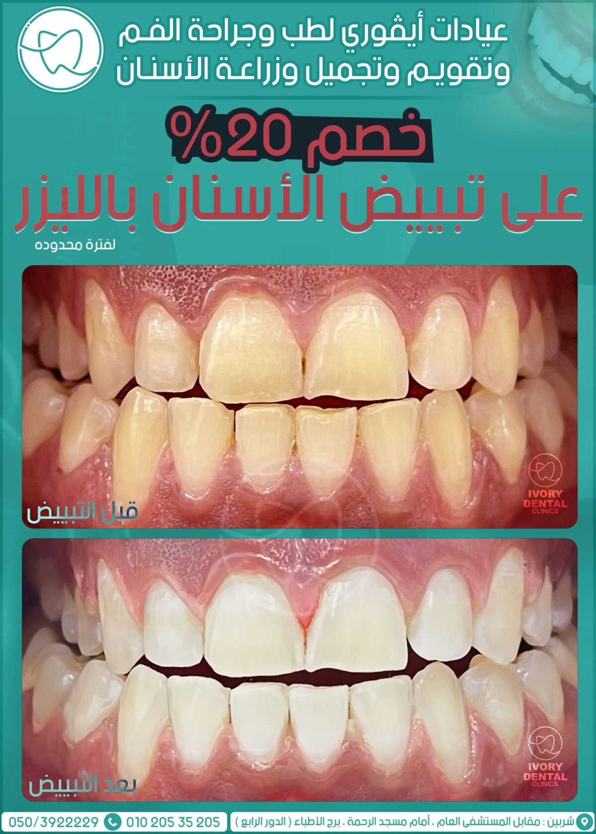 المواعيد مرنة، والحجز سهل سواء بالتليفون أو الواتساب، والأسعار واضحة ومحددة من البداية من غير أي مفاجآت. مع Ivory Dental Clinics هتلاقي الخبرة، التكنولوجيا الحديثة، والاهتمام براحتك في مكان واحد، عشان تحافظ على أسنانك وتستمتع بابتسامة تدوم لسنين.