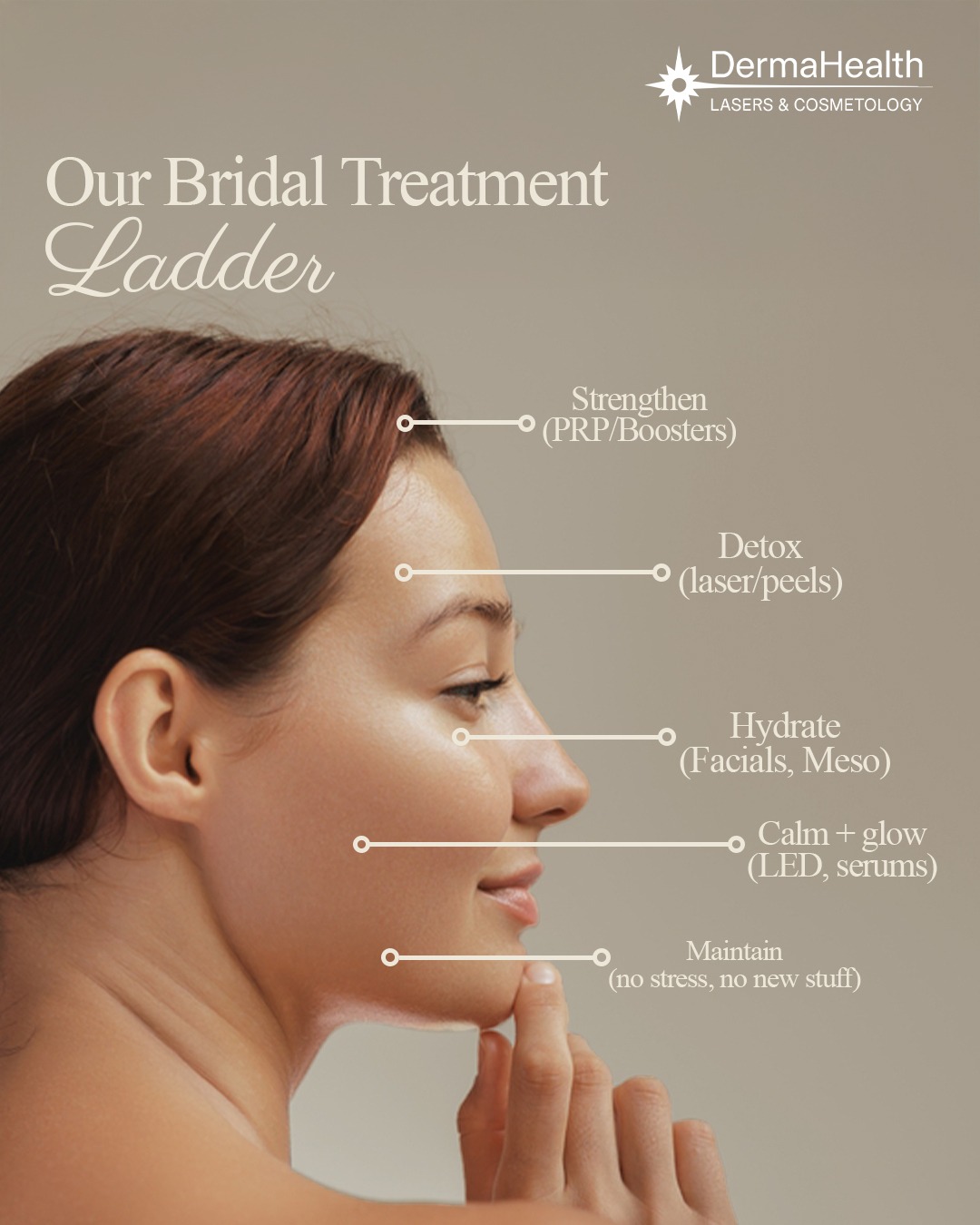 في DermaHealth أول حاجة بيهتموا بيها هي البشرة، لأنها الأساس اللي بيبان عليه كل حاجة بعد كده. العيادة بتقدم جلسات تنظيف عميق بتشيل الشوائب والزيوت وبتخلي البشرة ناعمة وصافية، وكمان في جلسات نضارة وتفتيح وتوحيد لون الجلد، ودي من أهم الخطوات اللي بتعمل فرق واضح في شكل العروسة قبل الفرح. العريس كمان ممكن يعمل جلسات بسيطة تخلي بشرته أنعم وأفتح وتدي شكل مريح وطبيعي في الصور.