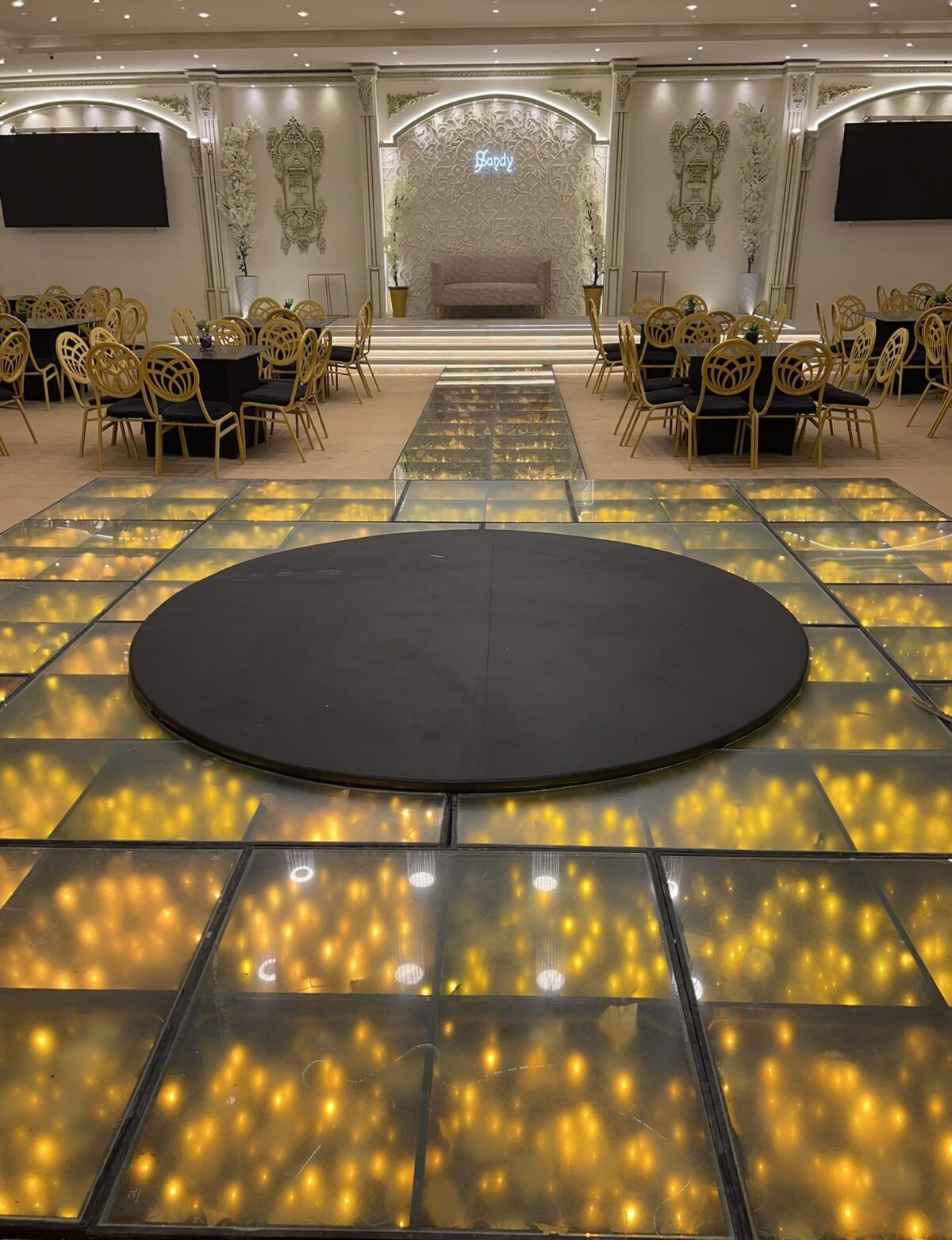 قاعة ساندي مساحتها متوسطة تناسب عدد ضيوف من 100 لحد 250 شخص حسب ترتيب الطاولات والكراسي المساحة مقسمة بشكل عملي فيه منطقة مخصصة للكوشة وممر واضح لدخول العروسين ومساحة كافية لترابيزات الضيوف ومنطقة للرقص أو الفقرات الترفيهية