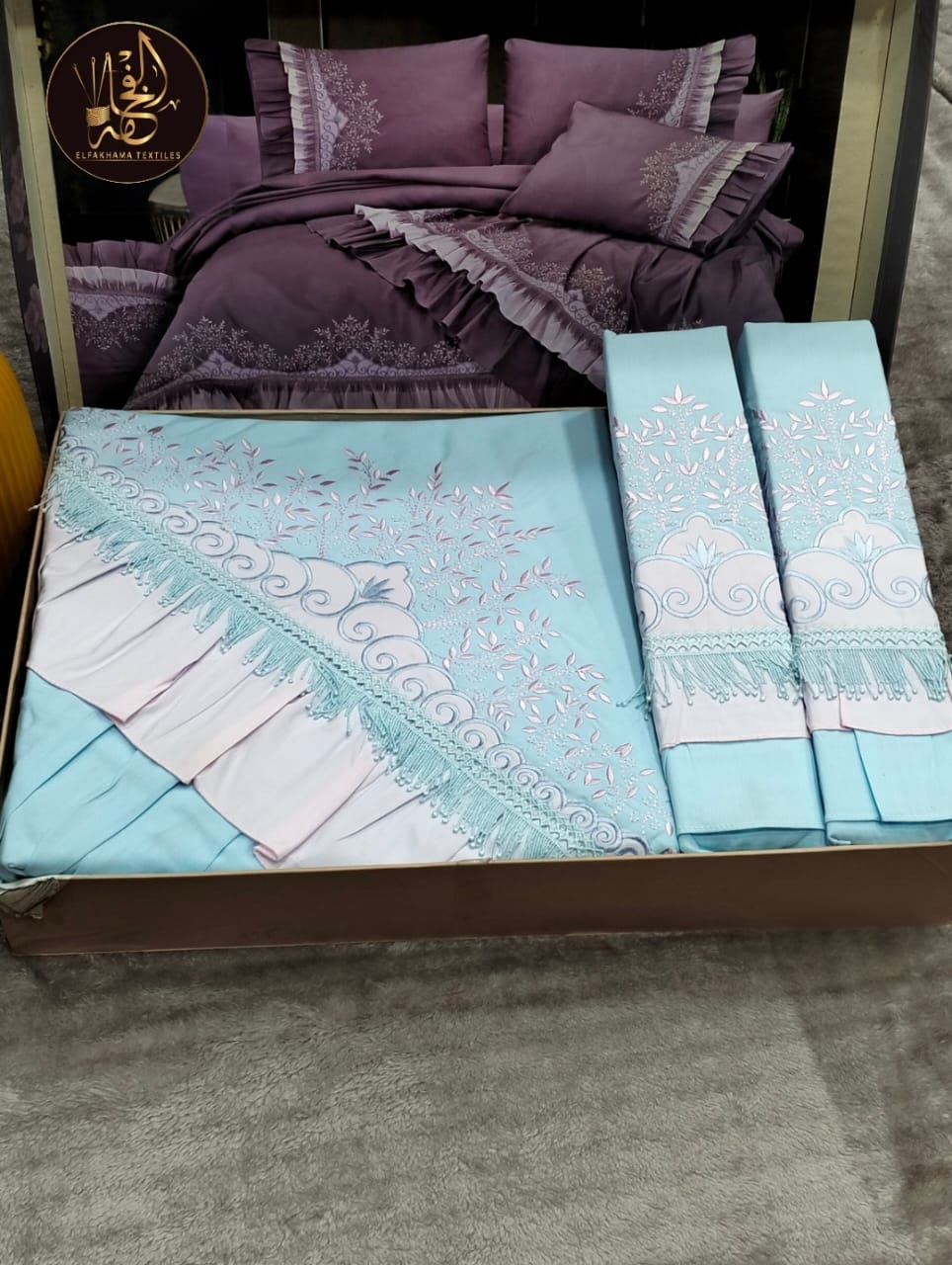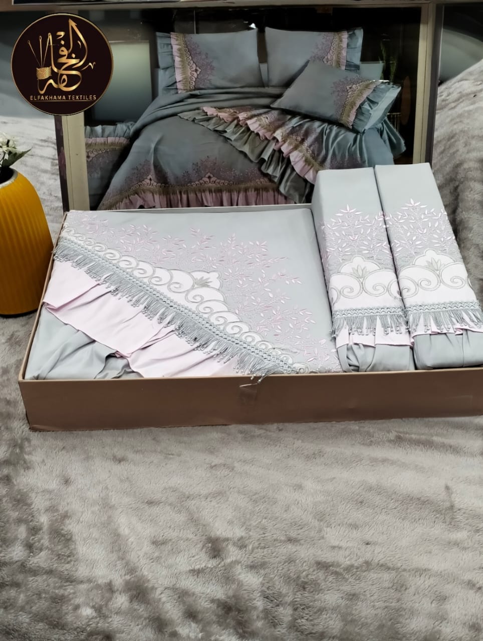 في الفخامة للمفروشات هتلاقي أطقم ملايات من قطن مصري 100% بعدد خيوط بيبدأ من 200 وبيوصل لـ 600، علشان تضمن النعومة والمتانة مع الاستخدام المستمر. الأطقم متوفرة بمقاسات مختلفة من المفرد للمزدوج وحتى الكينج سايز، ومعاها خداديّات وغطاء لحاف متناسقين في الألوان والنقوش.