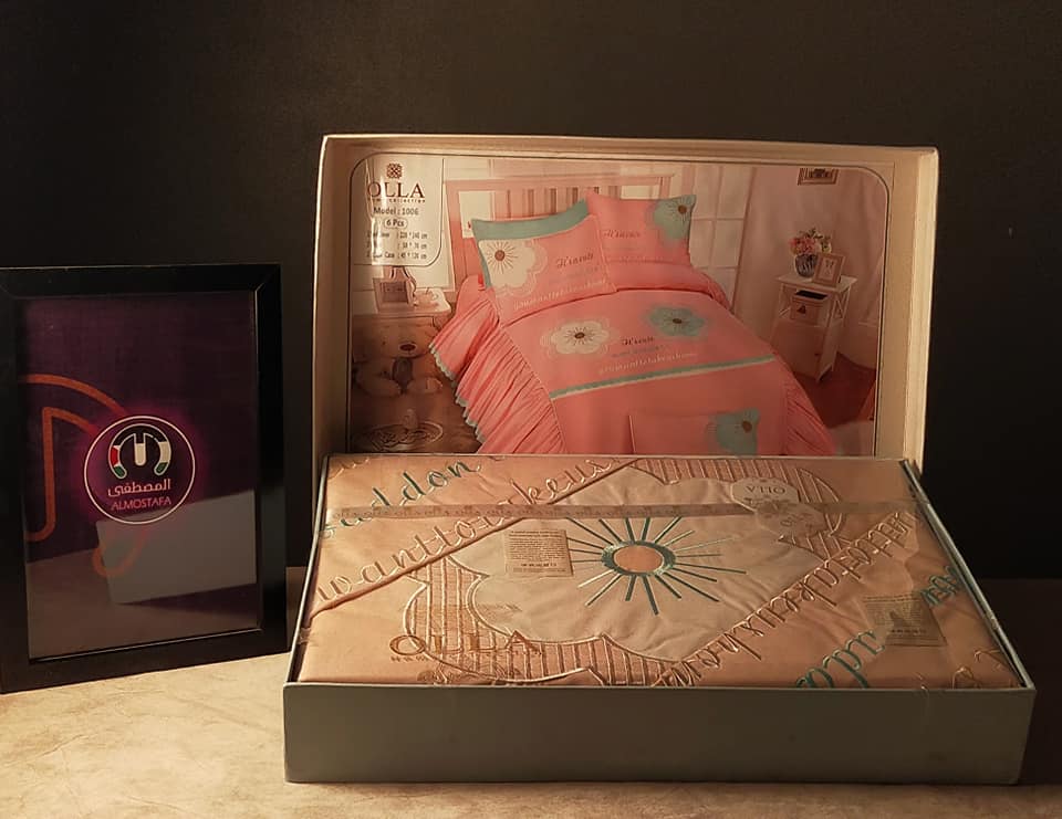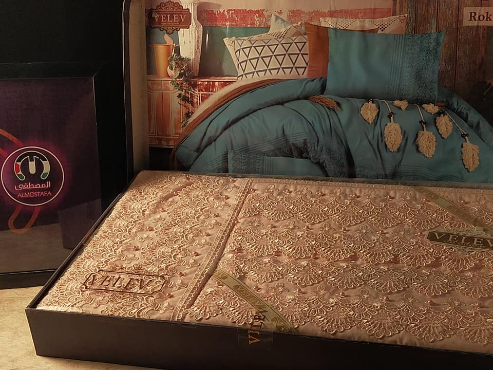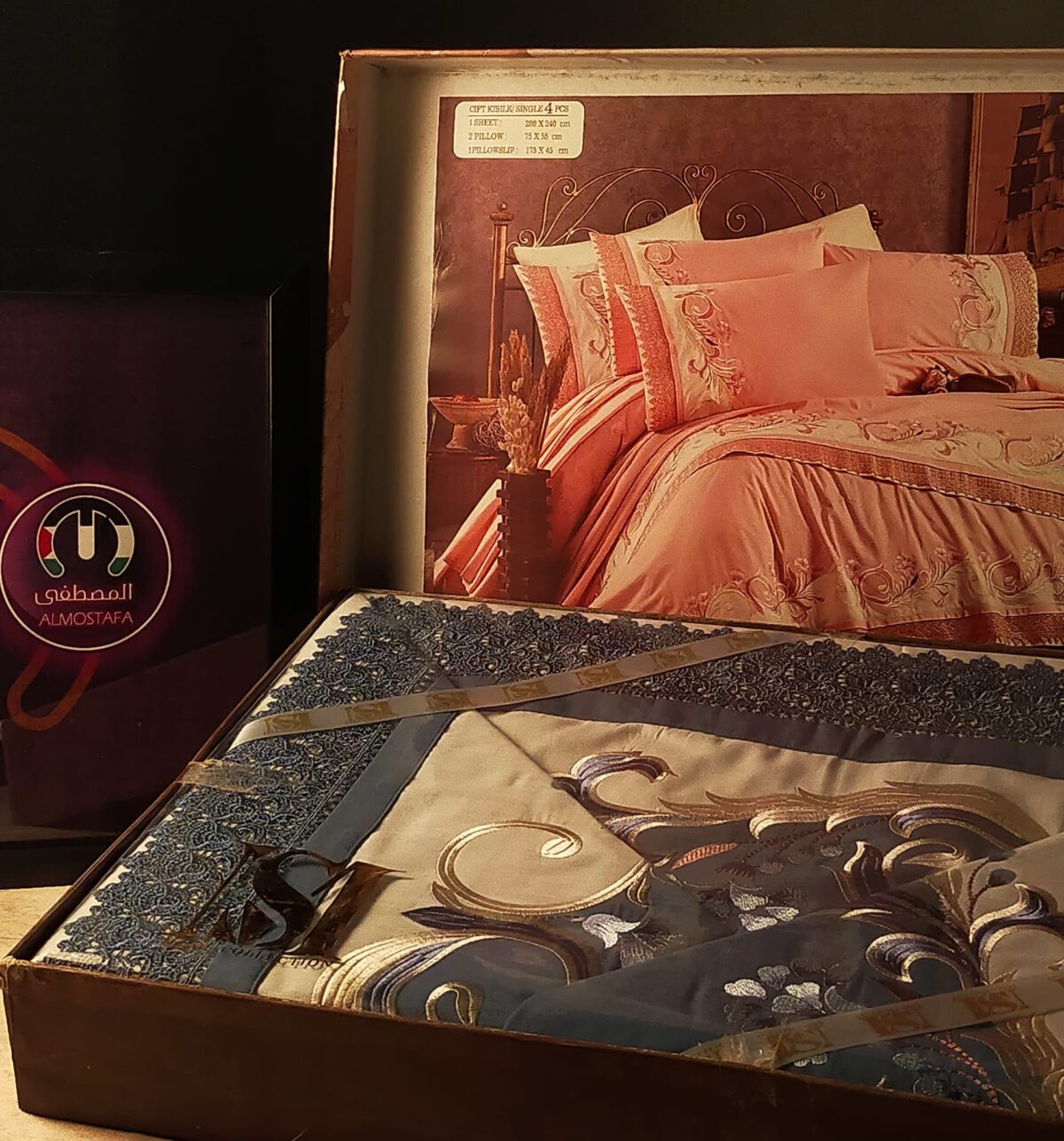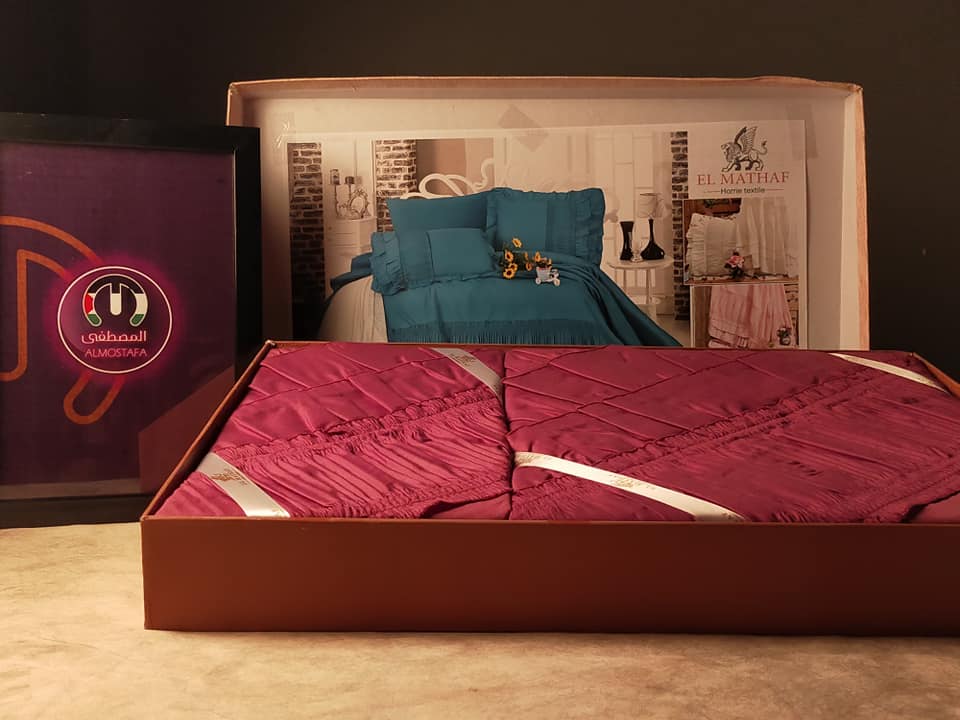 في معرض المصطفى هتلاقى ملايات قطن مصرى 100% بعدد خيوط بين 200 و600، علشان تجمع بين النعومة والمتانة حتى مع الغسيل المتكرر. الموديلات متوفرة بمقاسات مفرد، مزدوج، وكينج سايز، وكل طقم بييجى مع خداديّات وغطاء لحاف (Duvet Cover) متناسقين فى الألوان والنقشة. الدرجات اللونية متنوعة: أوف وايت، بيج، رمادى هادئ، وكمان خيارات جريئة زى الكحلى والزمردى.
